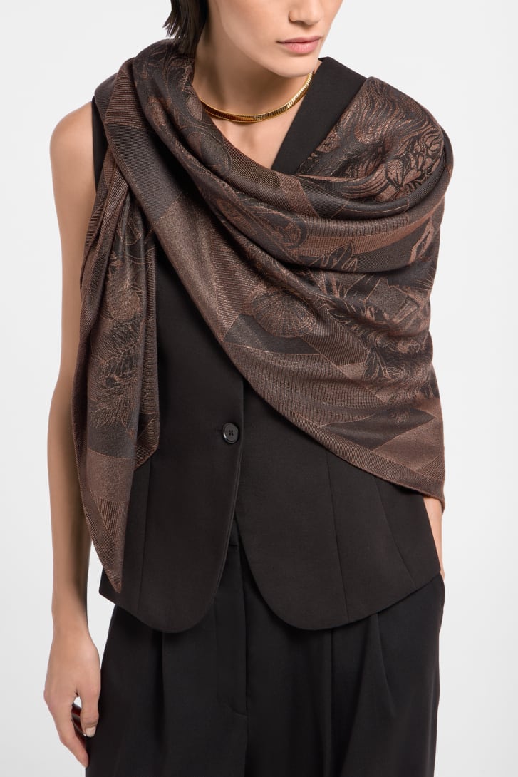 شال «بوليكروما لوكس» من الكشمير والحرير الفاخر باللون البني. صنع من 63% من الحرير، و24% من الكشمير، و8% من البوليستر، و5% من البولياميد.