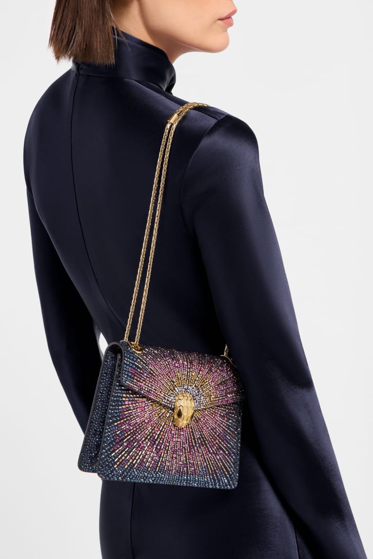 تعدّ حقيبة الكتف «سيربنتي فورإيفر داي-تو-نايت» صغيرة الحجم بمثابة تطور عصري لموديل كلاسيكي، وتستعرض التحولات العصرية لأناقتها وتنوعها وتصميمها الأيقوني، مرتقيةً بفضل الحِرفية الرفيعة التي أبدعتها. صُنِعت الحقيبة بمهارة عالية من جلد السويد باللون الأسود، وزُينت يدوياً بأحجار كريستال فايروركس متدرجة الألوان، التي تشكِّل زخارف مُبتَكَرة ومتلألئة تسلب الأنظار. تتميّز هذه القطعة بسلسلة قابلة للتقصير في شكل جسم ثعبان مع حمّالة جلدية، ويتوّجها زر إقفال مغناطيسي على شكل رأس الثعبان الأيقوني، الذي استوحى تصميمه وحراشفه الساحرَين من مجوهرات «سيربنتي» التي تعود إلى حقبة الستينيات، وتتميّز بتأثير يحاكي قطع الألماس، أي بملمس خشن لمّاع يتلألأ كألماس مرصوف بالترصيع الثلجيّ. يحتوي هذا الموديل على حجرة واحدة، ويكمله جيب داخلي مفتوح وجيب للمرآة مع مرآة قابلة للتعديل. 19 × 14 × 4 سم - 7.5 × 5.5 × 1.6 إنش. صناعة إيطالية.