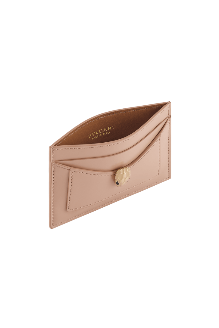 حمالة البطاقات «سيربنتي فورإيفر» مصنوعة من جلد العجل بلون الترافرتين من الخارج وبطانة من جلد نابا بلون اليشب الصحراوي. حلية تزيين على شكل رأس ثعبان آسر من النحاس المطلي باللون الذهبي والمزين بالمينا بلون البيج البندقي، مع عينين من المينا الأسود.