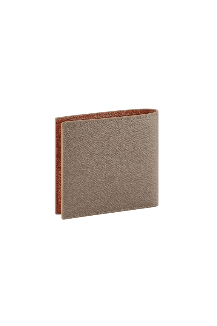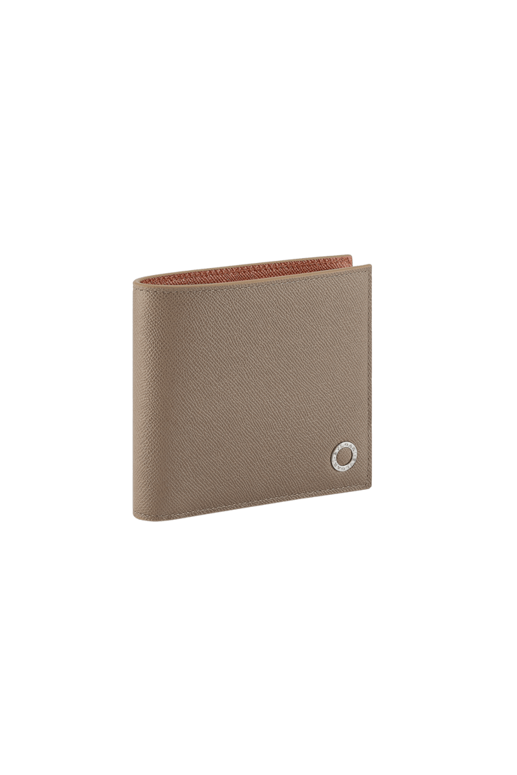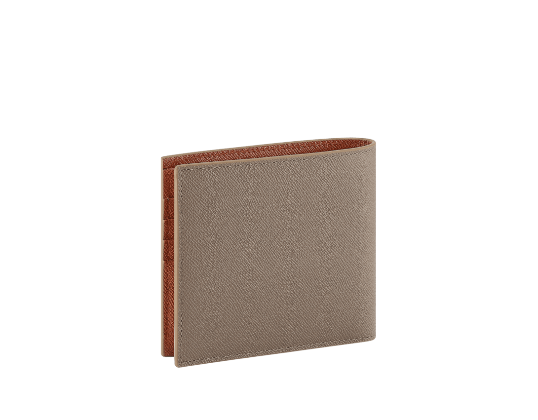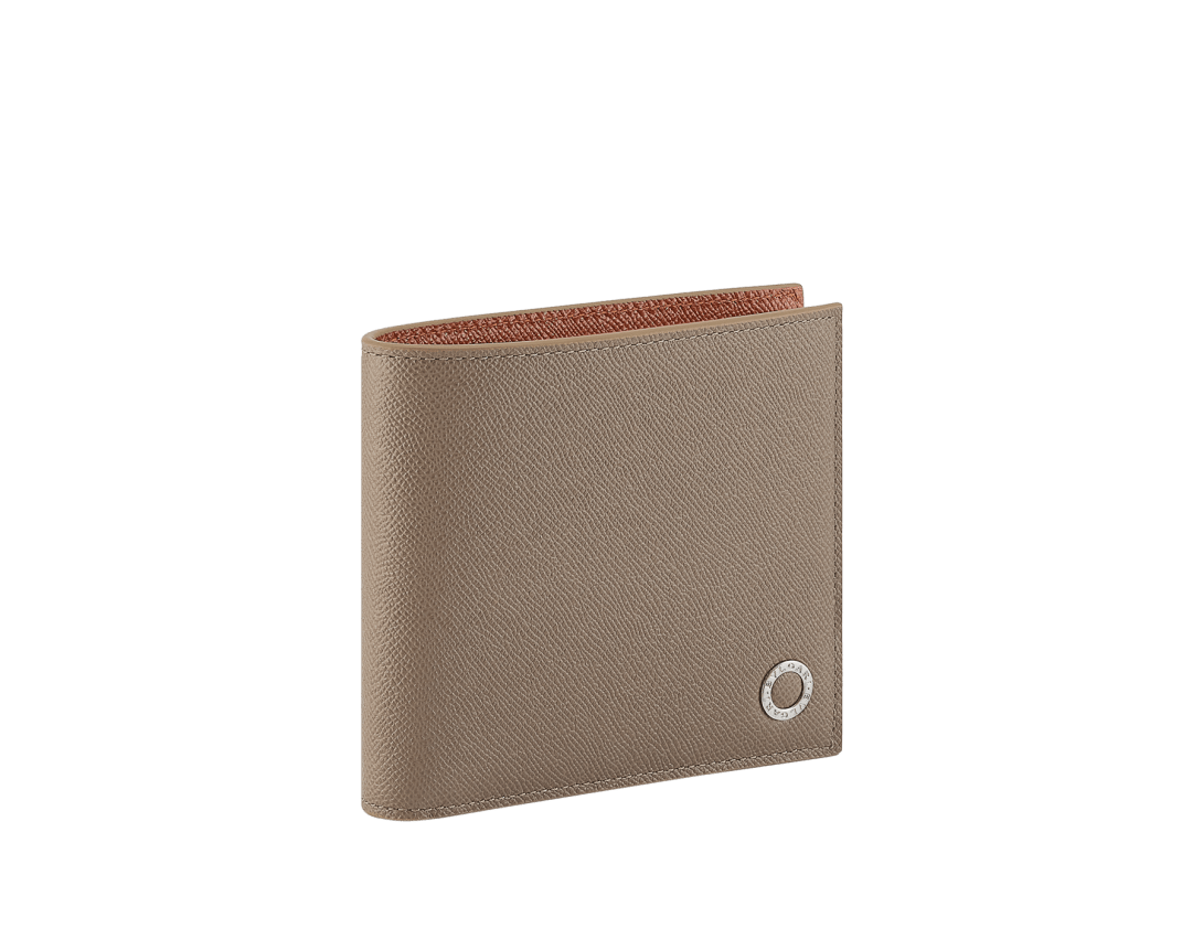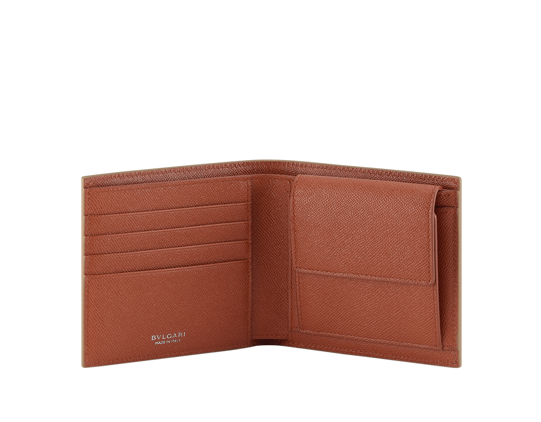 محفظة ين «بولغري بولغري مان» مدمجة، مصنوعة من جلد العجل الخشن بلون حجر القمر من الخارج واللون الكهرماني من الداخل. يزينها مشبك أيقوني من النحاس المطلي بالبالاديوم وغطاء قابل للطي.