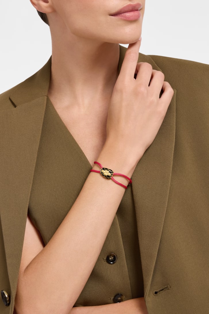 Das Serpenti Forever Armband aus rubinrotem Stoff. Die Kreation zeichnet sich durch einen unwiderstehlichen Schlangenkopf-Dekor aus, dessen Schuppen und hypnotisierendes Design von den unverkennbaren Serpenti Schmuckkreationen aus den 1960ern inspiriert sind. Einheitsgröße mit verstellbarem Verschluss. 14,5 cm – 22 cm (Umfang des Handgelenks). Made in Italy.