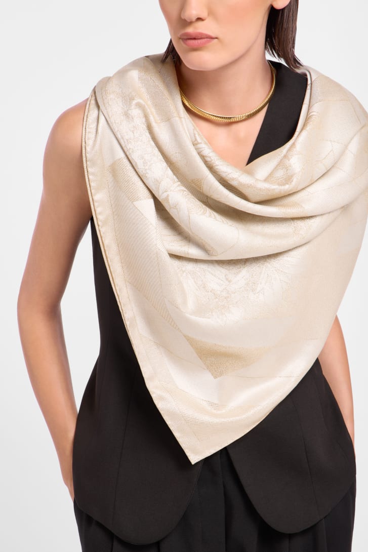 Crafted in fine natural silk, cashmere and lurex, the Polychroma Lux scarf translates the theme of Bvlgari's Polychroma High Jewellery collection – an ode to the richness of colour – into a precious evening style. Its bold and multifaceted design evokes the brilliance of a cut gem, while framing the Mirror of Venus as an emblem of reflected beauty and timeless heritage. A testament to Bvlgari’s unrivalled mastery, the scarf is realised with a high-quality jacquard technique that requires multiple fabrics to achieve its sophisticated allure. Offering many styling options, this lightweight and refined accessory can be tied around the neck for an iconic look or wrapped around the waist as a seductive belt. 140 x 140 cm – 55.1 x 55.1 inches. 63% silk, 24% cashmere, 8% polyester, 5% polyamide. Handmade in Italy.