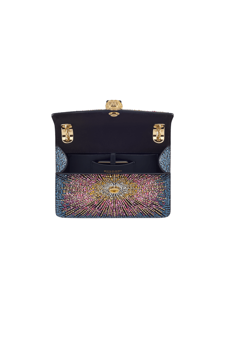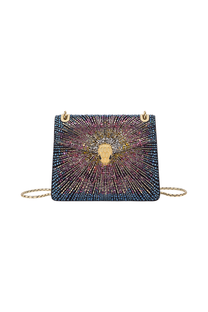 Serpenti Forever Day-to-Night small shoulder bag in multigradient Fireworks Crystals with black nappa leather lining. Captivating snakehead magnetic closure in gold-plated brass embellished with diamond-cut engraving on the scales, and black onyx eyes.