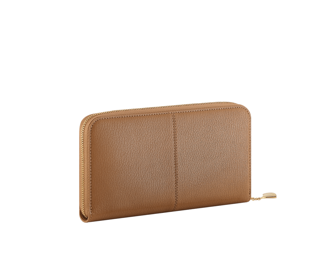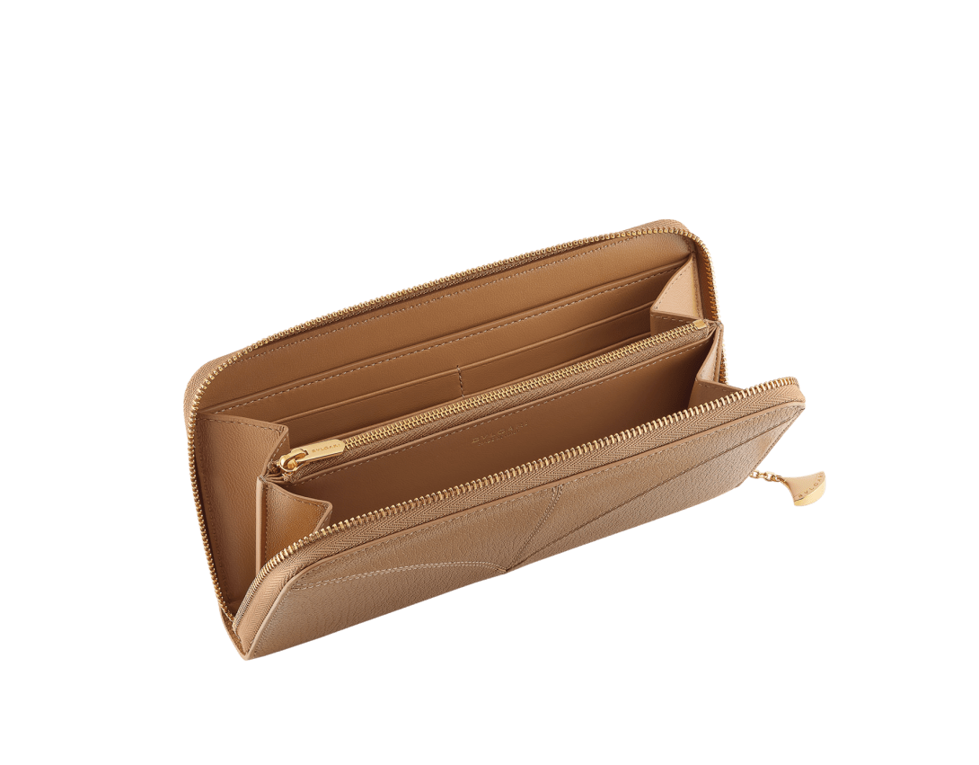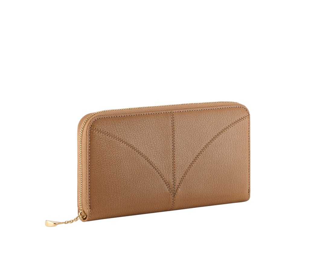 Crafted in grainy yet compact desert jasper goat leather on the outside and desert jasper nappa leather on the inside, the Divas' Dream large wallet is embellished with the collection’s fan-shaped signature aesthetic, inspired by Bvlgari’s jewellery DNA and Roman cultural heritage. This elegant and refined model features a zip around closure with a metallic Divas' Dream charm and is completed with an internal partition zipped pocket, two bill compartments, two flat pockets and eight credit card slots. Made in Italy.
