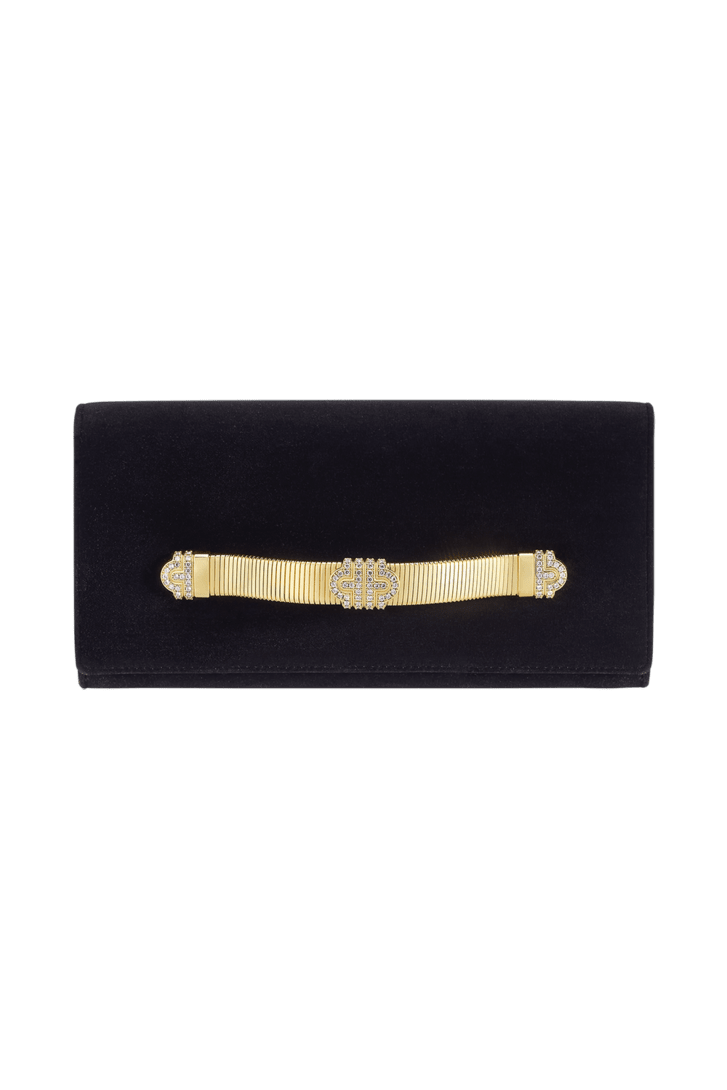 An elegant blend of Bvlgari's jewellery and leather goods universes, the timeless Bvlgari Tubogas evening clutch is crafted in black velvet. Its jewellery-inspired handle reproduces the sinuous coils of Tubogas – a Maison signature since the 1940s – and is further enriched with the geometric Parentesi motif, deeply rooted in Rome's cultural legacy. The model is completed by a single compartment, an internal card slot and the Bvlgari metal logo on the back. 25 x 12.5 x 3.5 cm – 9.8 x 4.9 x 1.4 inches. Made in Italy.