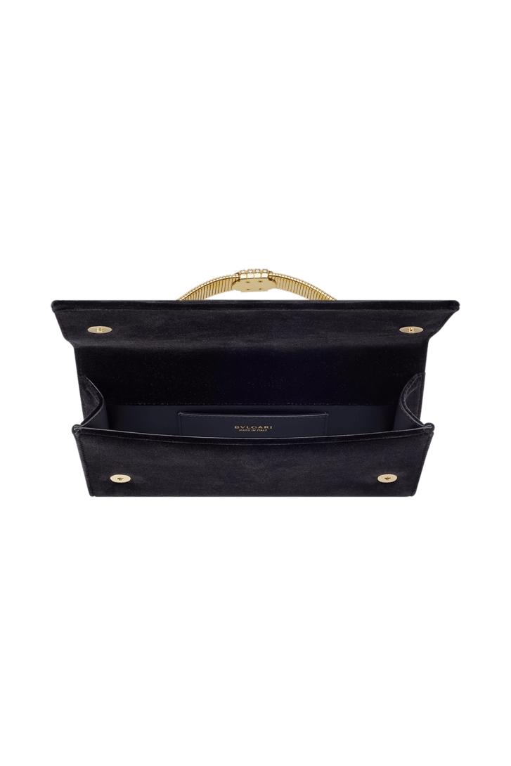 Bvlgari Tubogas evening clutch in black velvet with black nappa leather lining. Iconic Tubogas handle in gold-plated brass embellished with zirconia and a magnetic closure.