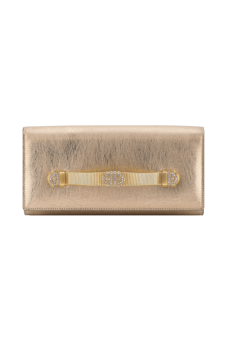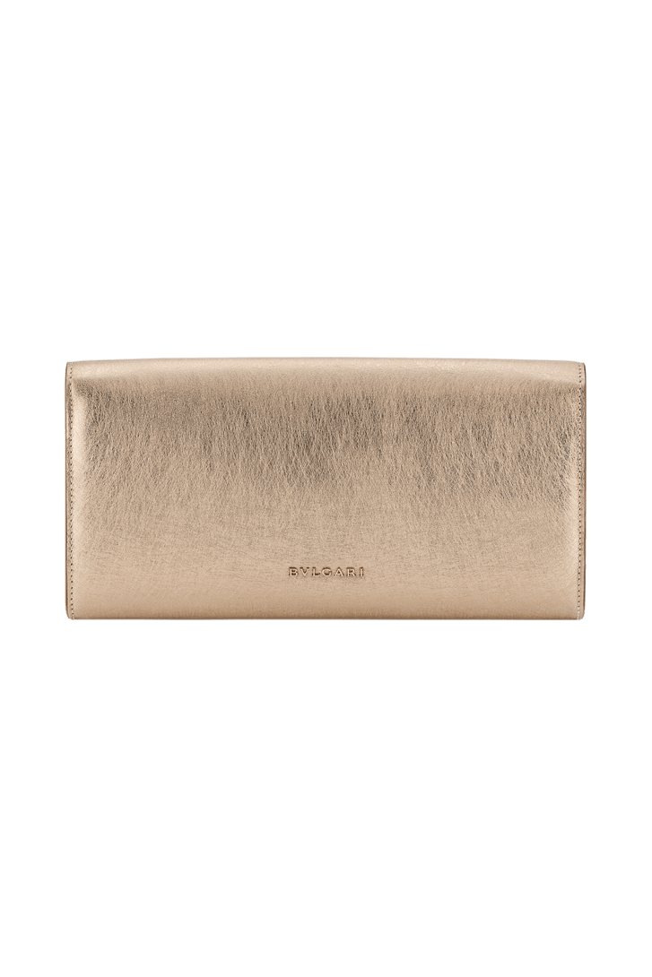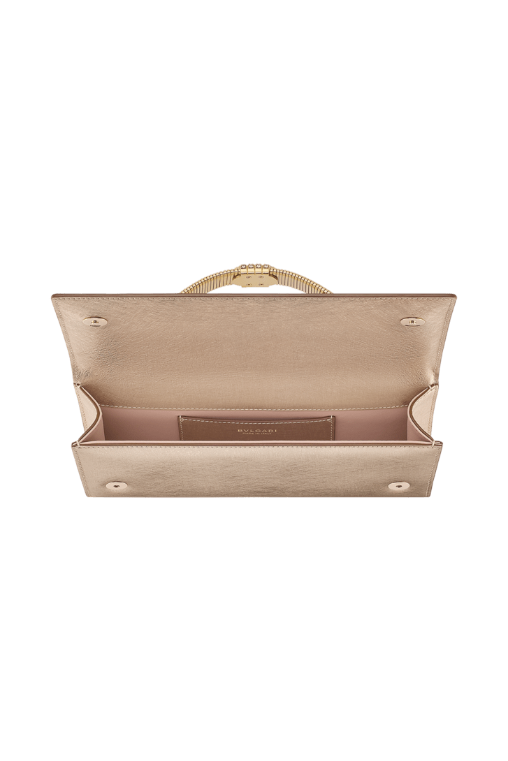 An elegant blend of Bvlgari's jewellery and leather goods universes, the timeless Bvlgari Tubogas evening clutch is crafted in gold striated calfskin, boasting a metallic and streaked effect that recalls the beautiful inclusions of rough diamonds. Its jewellery-inspired handle reproduces the sinuous coils of Tubogas – a Maison signature since the 1940s – and is further enriched with the geometric Parentesi motif, deeply rooted in Rome's cultural legacy. The model is completed by a single compartment, an internal card slot and the Bvlgari metal logo on the back. 25 x 12.5 x 3.5 cm – 9.8 x 4.9 x 1.4 inches. Made in Italy.