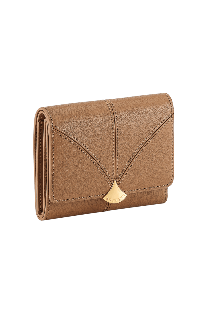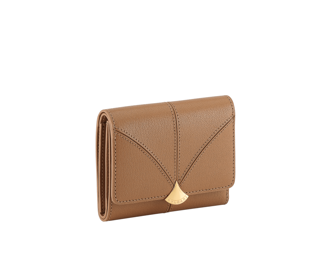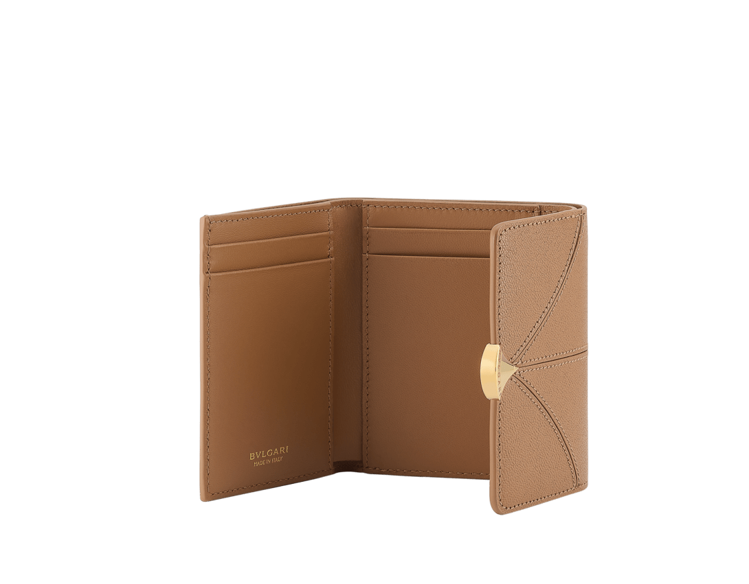 Crafted in grainy yet compact desert jasper goat leather on the outside and desert jasper nappa leather on the inside, the Divas' Dream compact wallet features the collection’s signature aesthetic, inspired by Bvlgari’s jewellery DNA and Roman cultural heritage. This elegant model is embellished with the metallic fan-shaped Divas' Dream press button closure and is completed with one bill compartment, two internal flat pockets, four credit card slots and an external coin pocket. Made in Italy.