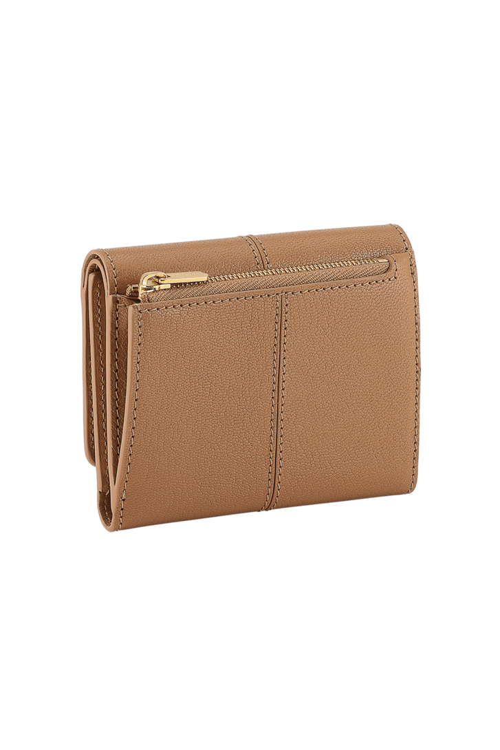 Divas' Dream compact wallet in desert jasper goat leather with desert jasper nappa leather interior. Refined signature press button closure in gold-plated brass.