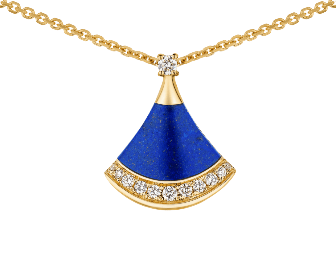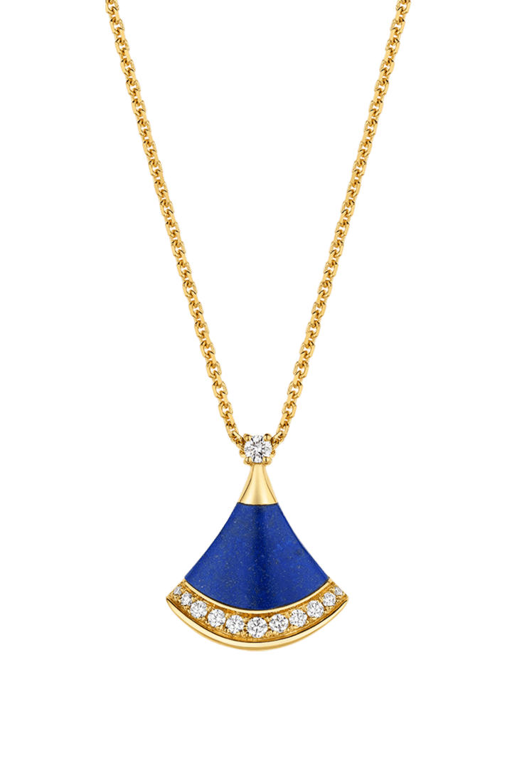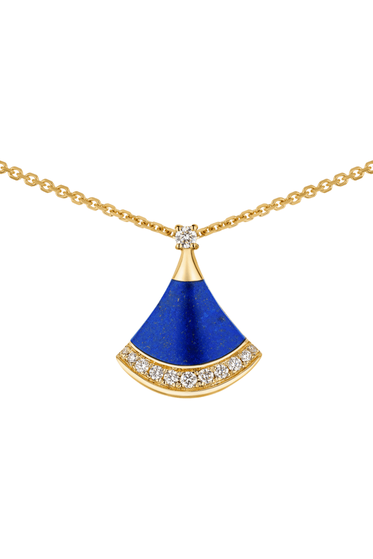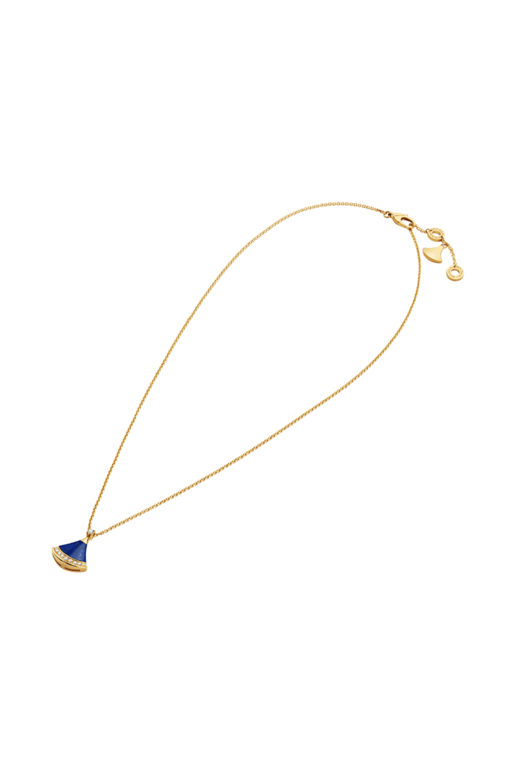 A refined expression of joyful femininity, the Divas' Dream 18 kt yellow gold pendant necklace celebrates harmony and inner radiance through the iconic ginkgo-shaped motif, deeply rooted in Bvlgari's Roman heritage. In this Spring Edition, a lapis lazuli element—associated with the sky—reveals a deep blue hue studded with natural golden specks, evoking a star-strewn firmament. Set with a round brilliant-cut diamond and framed by pavé diamonds, the jewel captures a sense of spontaneous beauty and luminous brilliance.