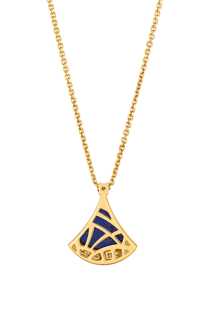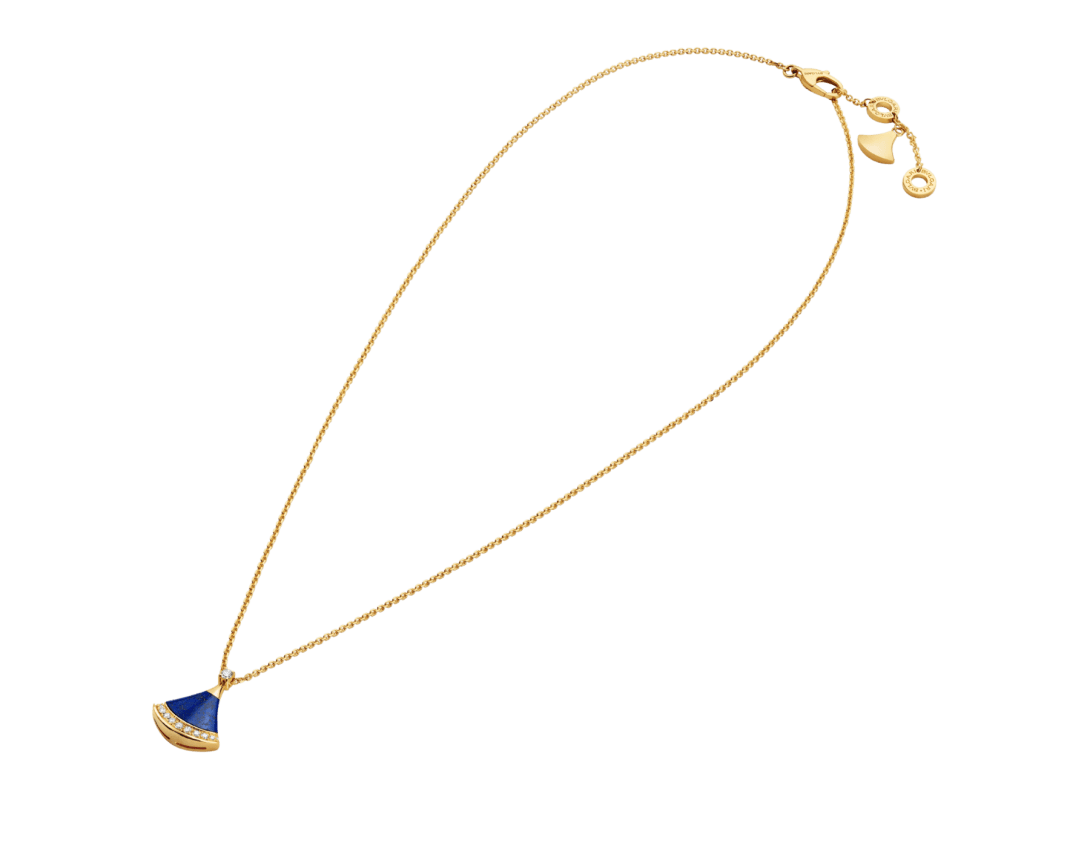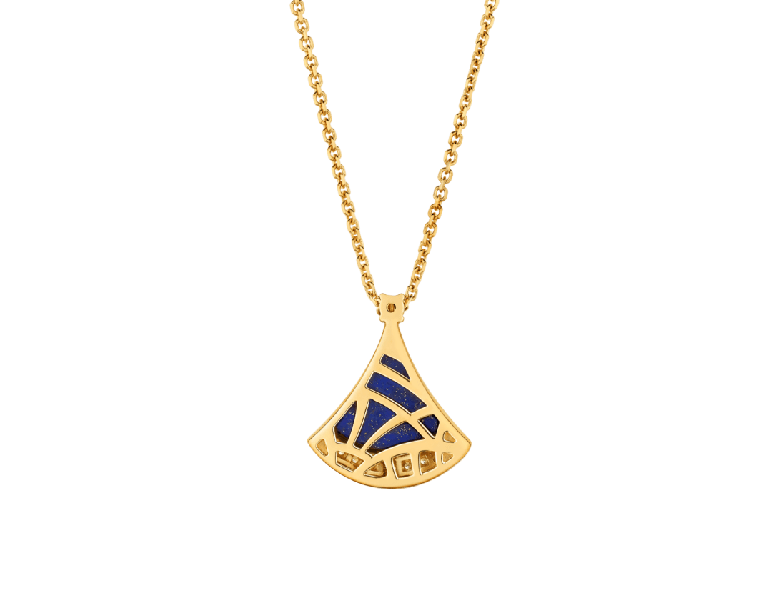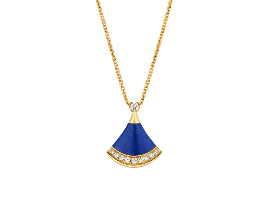 A refined expression of joyful femininity, the Divas' Dream 18 kt yellow gold pendant necklace celebrates harmony and inner radiance through the iconic ginkgo-shaped motif, deeply rooted in Bvlgari's Roman heritage. In this Spring Edition, a lapis lazuli element—associated with the sky—reveals a deep blue hue studded with natural golden specks, evoking a star-strewn firmament. Set with a round brilliant-cut diamond and framed by pavé diamonds, the jewel captures a sense of spontaneous beauty and luminous brilliance.