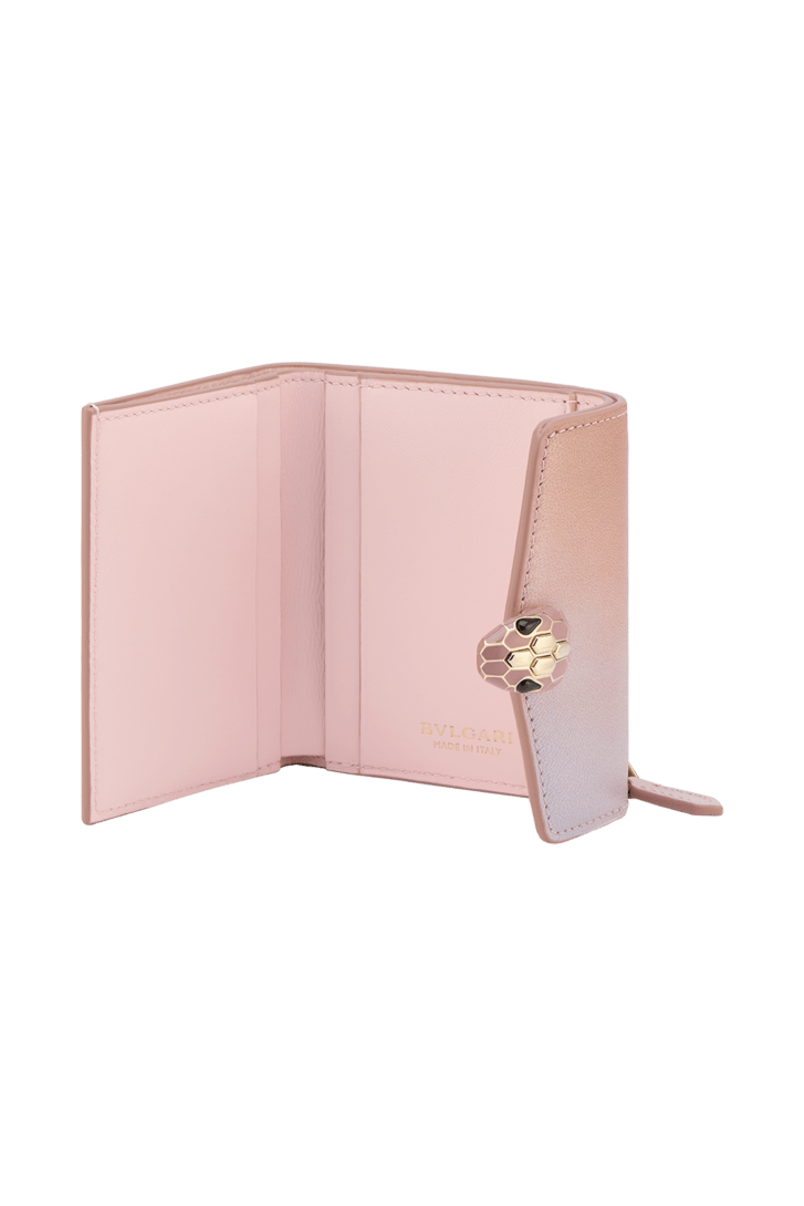 Serpenti Forever compact wallet in pearl pink goat leather with pearl pink nappa leather interior. Captivating snakehead press-button closure in light gold-plated brass embellished with pale pink enamel and light gold-plated brass scales, and black onyx eyes.