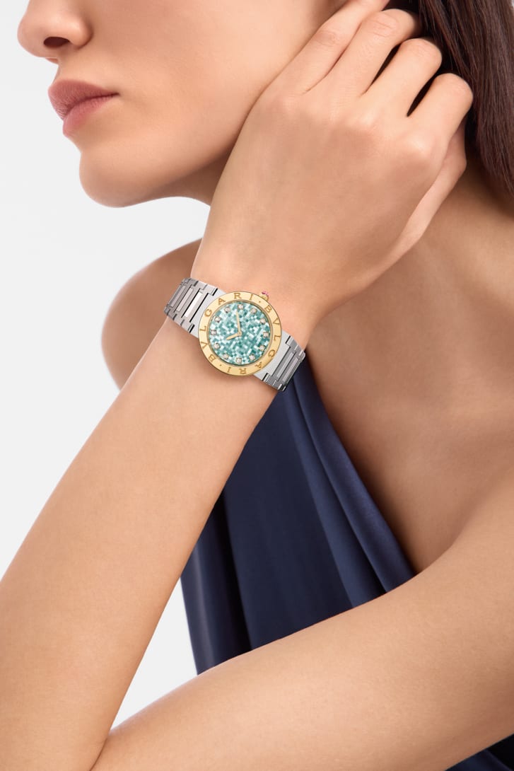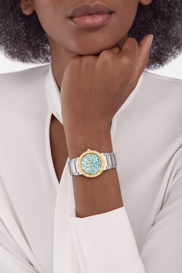 Bvlgari Bvlgari watch in polished and satin-brushed stainless steel with 18 kt yellow gold bezel, engraved with the double logo, green mother-of-pearl dial and 12 diamond indexes. Water-resistant up to 30 metres