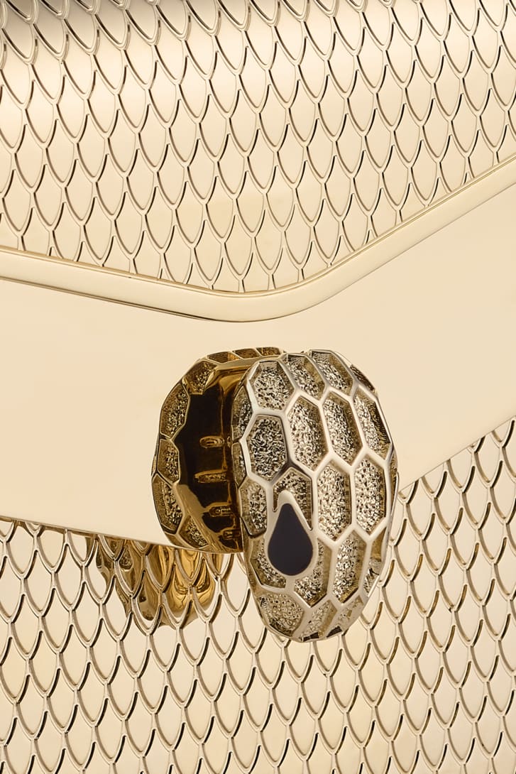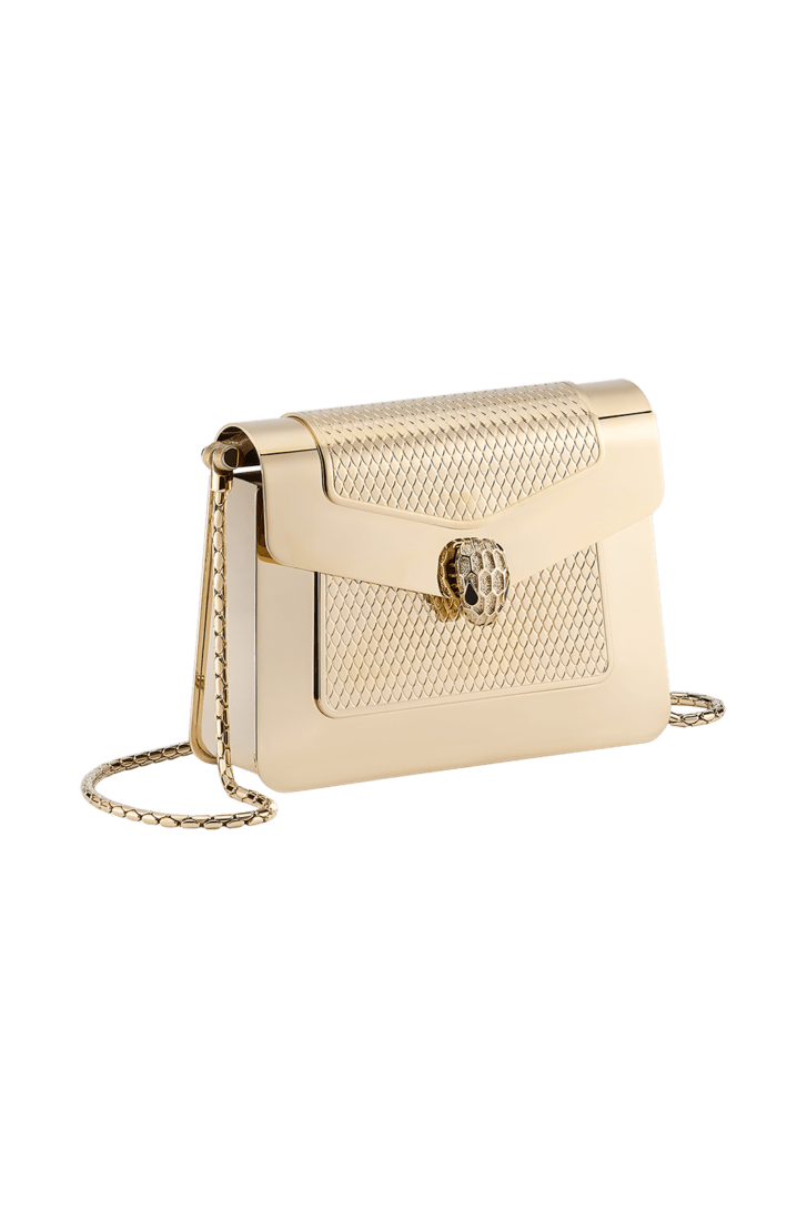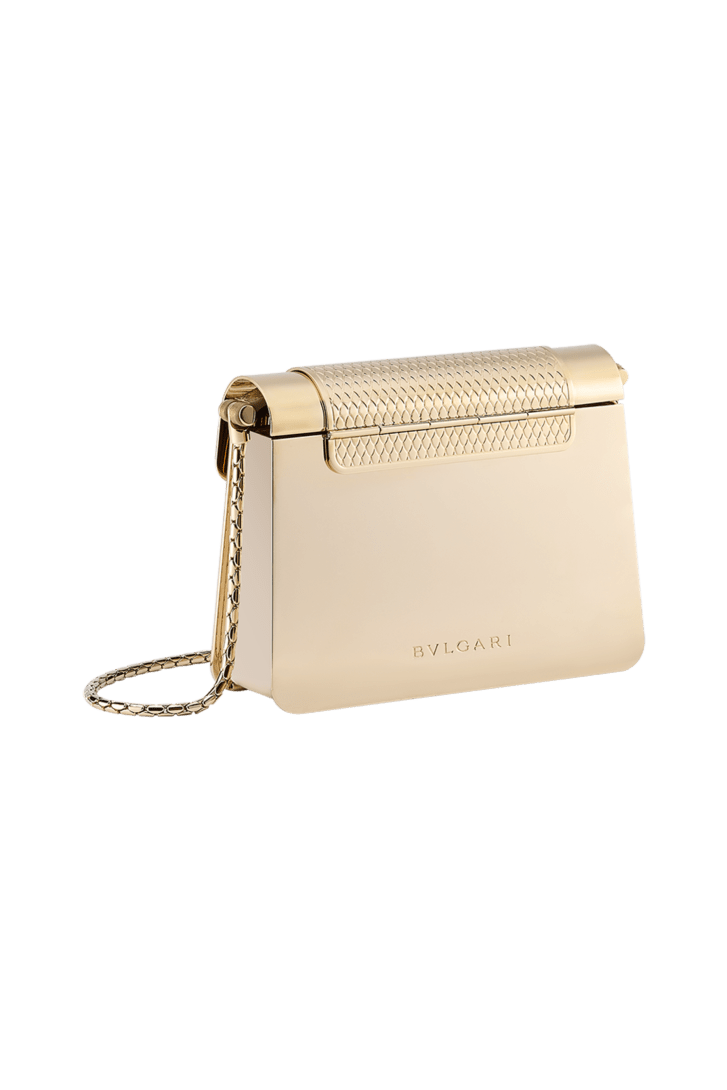 Introducing an unconventional design to the world of leather goods, the Serpenti Forever micro bag is crafted from light gold-plated brass with engraved scales in the centre and antique gold Liquid Metal calf leather with a metallic and slightly grainy effect inside. Ideal for adding a touch of glam to any look while perfectly fitting all women’s essentials such as credit cards, headphones and a lipstick, the alluring creation features the iconic magnetic snakehead fastening, whose mesmerising design and scales, engraved with a small diamond using the so-called "diamantatura" goldsmith technique, draw on the Serpenti jewels of the '60s. Endowed with a snake-body-shaped chain strap, the stylish yet functional model features a flap fastening, a single compartment and the Bvlgari logo engraved on the back. 13 x 8.5 x 3.5 cm - 5.1 x 3.3 x 1.4 inches. Made in Italy.