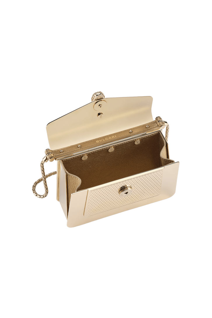 Serpenti Forever micro bag in light gold-plated brass with engraved scales in the centre and antique gold Liquid Metal calf leather interior. Captivating magnetic snakehead closure in light gold-plated brass embellished with "diamantatura" engraving on the scales and black enamel eyes.