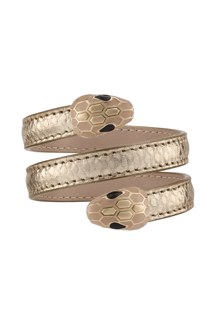 Serpenti Forever Cleopatra multi-coil bangle bracelet in light gold Molten karung leather. Captivating double snakehead motif in light gold-plated brass embellished with champagne enamel and light gold-plated brass scales, and black enamel eyes.