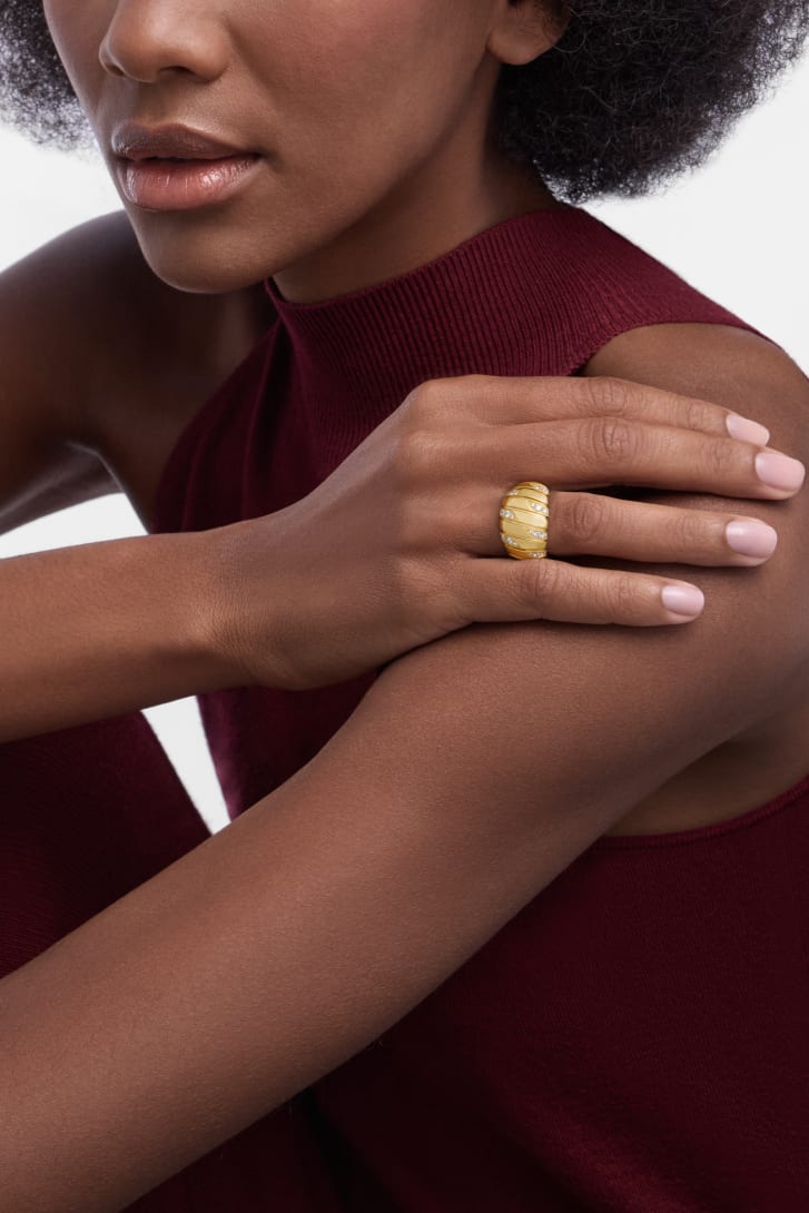 Elevating the jewellery technique cherished by the Roman Maison since the 1940s into an iconic collection, Bvlgari Tubogas is a testament to Bvlgari’s drive for experimentation and its ability to transform precious metal like living matter. Born from a unique blend of avant-garde industrial design and superior artisanal mastery, the Bvlgari Tubogas ring in 18 kt yellow gold is embellished with diamond-set geometric studs, exalting the creation’s eternally contemporary and distinctive style.