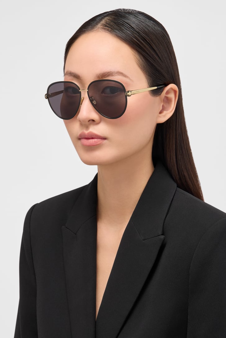 Serpenti Forever sunglasses with pilot frame in gold-finished metal, black profile and grey lenses. Inspired by the iconic clasp of Serpenti bags, the temples feature a precious snakehead hinge embellished with hand-applied enamels, making this style irresistibly captivating.
