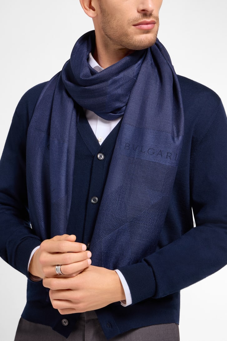 Crafted in lapis cashmere, the Logo Poly Soft stole is a versatile, genderless accessory born from the finest quality materials. Featuring a refined jacquard design with geometric motifs enriched by the Bvlgari logo, it is realised with a special frame that employs only the highest quality fibres, ensuring exceptional warmth and comfort. Modern and sophisticated, it can be styled around the neck in multiple ways or draped over the shoulders for a refined allure. 70 x 190 cm – 27.6 x 74.8 inches. 100% cashmere. Handmade in Italy.