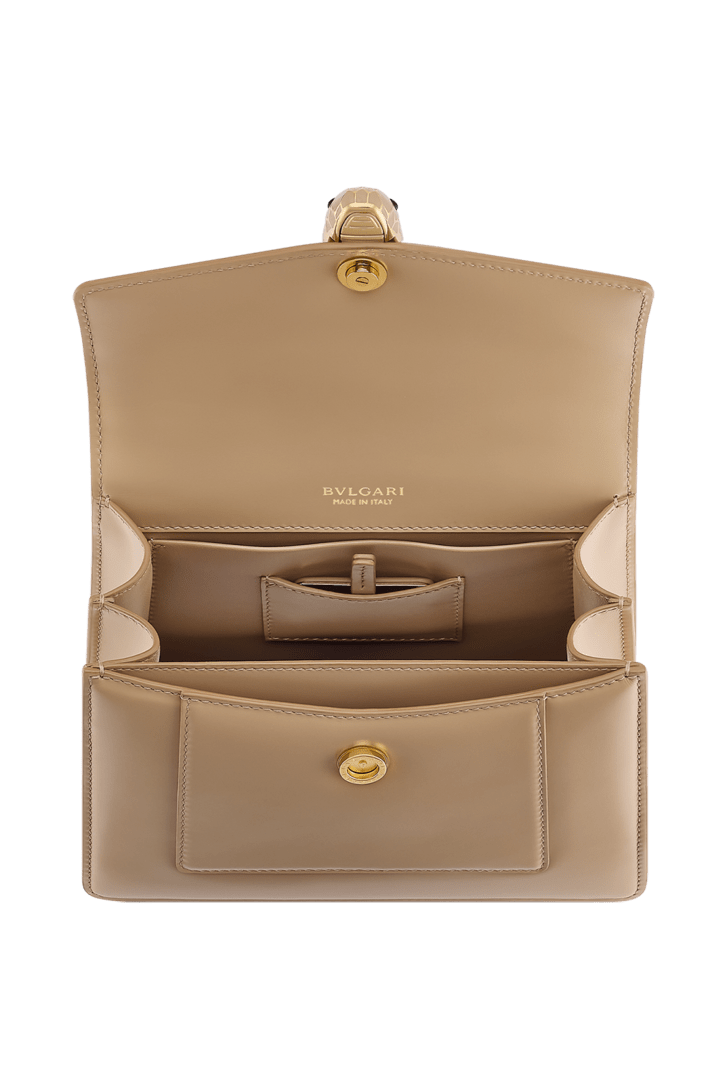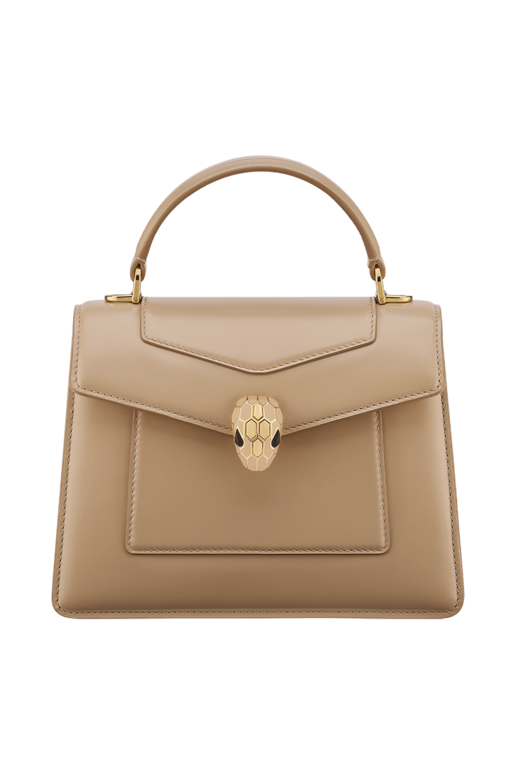 Serpenti Forever medium top handle bag in Travertine calf leather with black nappa leather lining. Captivating snakehead magnetic closure in gold-plated brass embellished with beige noisette enamel and gold-plated brass scales, and black onyx eyes.