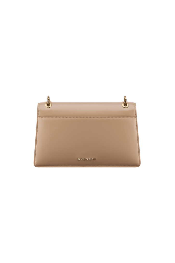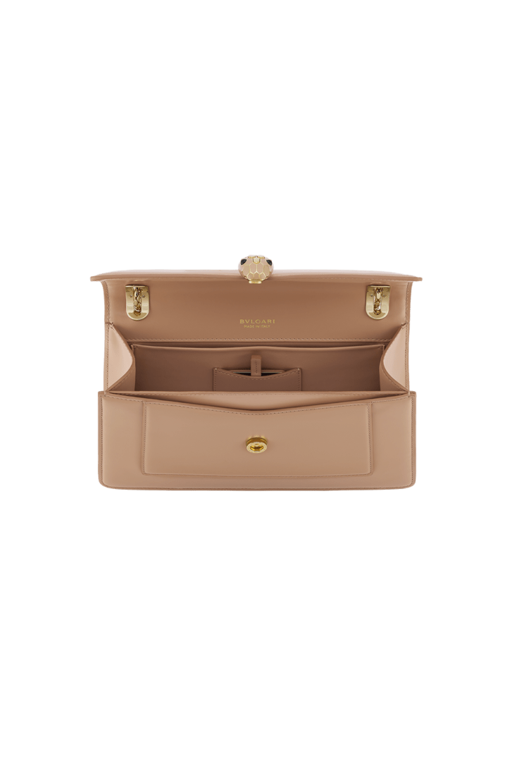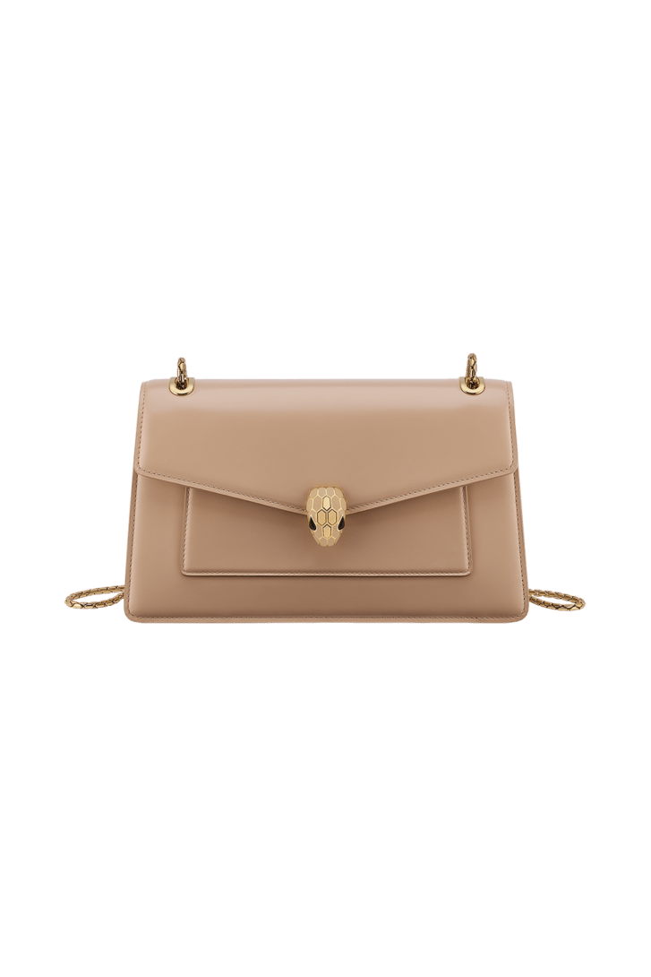 Serpenti Forever medium shoulder bag in Travertine calf leather with Travertine nappa leather lining. Captivating snakehead magnetic closure in gold-plated brass embellished with beige noisette enamel and gold-plated brass scales, and black onyx eyes.