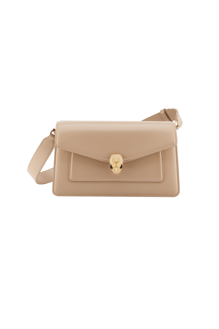 Serpenti Forever small crossbody bag in Travertine calf leather with Travertine nappa leather lining. Captivating snakehead magnetic closure in gold-plated brass embellished with beige noisette enamel and gold-plated brass scales, and black onyx eyes.