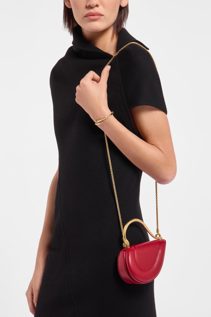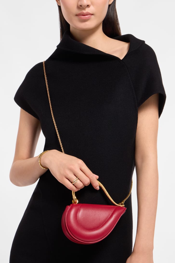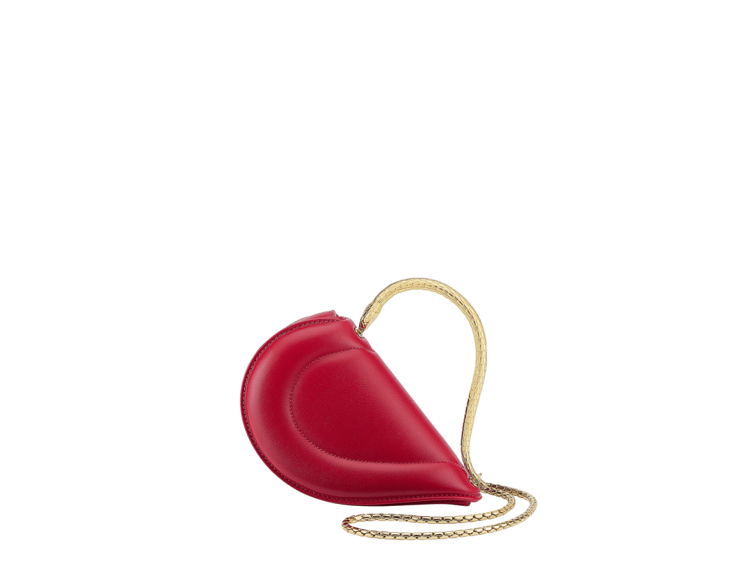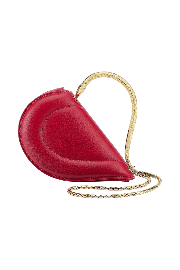 Reimagining the distinctive heart shape in a more compact size as a jewel-like miniature, the Serpenti Cuoricino mini top handle bag is crafted in premium matelassé royal ruby calfskin, showcasing a visually appealing and soft padded effect. Drawing inspiration from Bvlgari’s archives and unrivalled jewellery DNA, the bag’s serpentine metallic handle recalls a famed Serpenti jewellery watch from 1968. The distinctive snake body-shaped chain is detachable, allowing it to be worn in different ways. Featuring a single compartment, the model is complete with a press-button closure and two internal card pockets. Made in Italy.