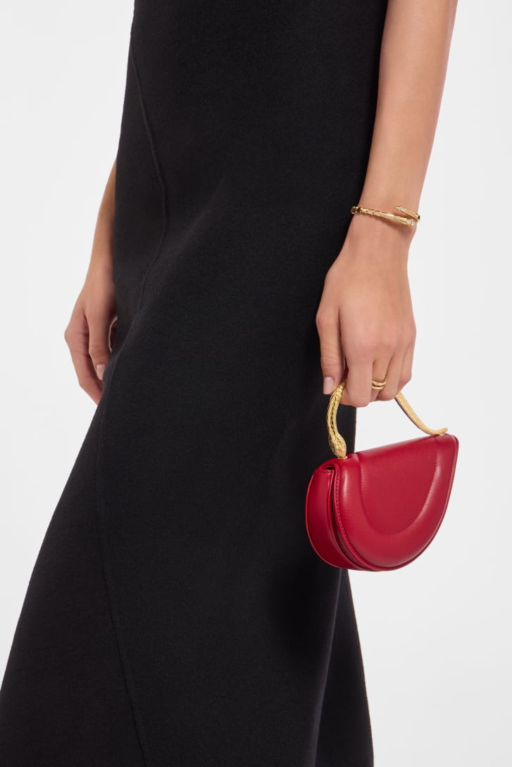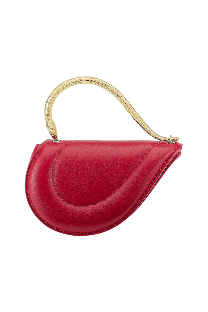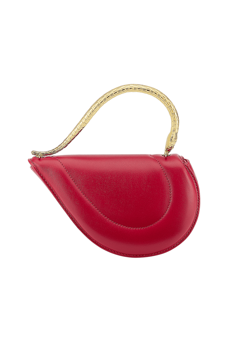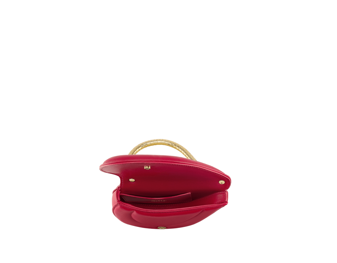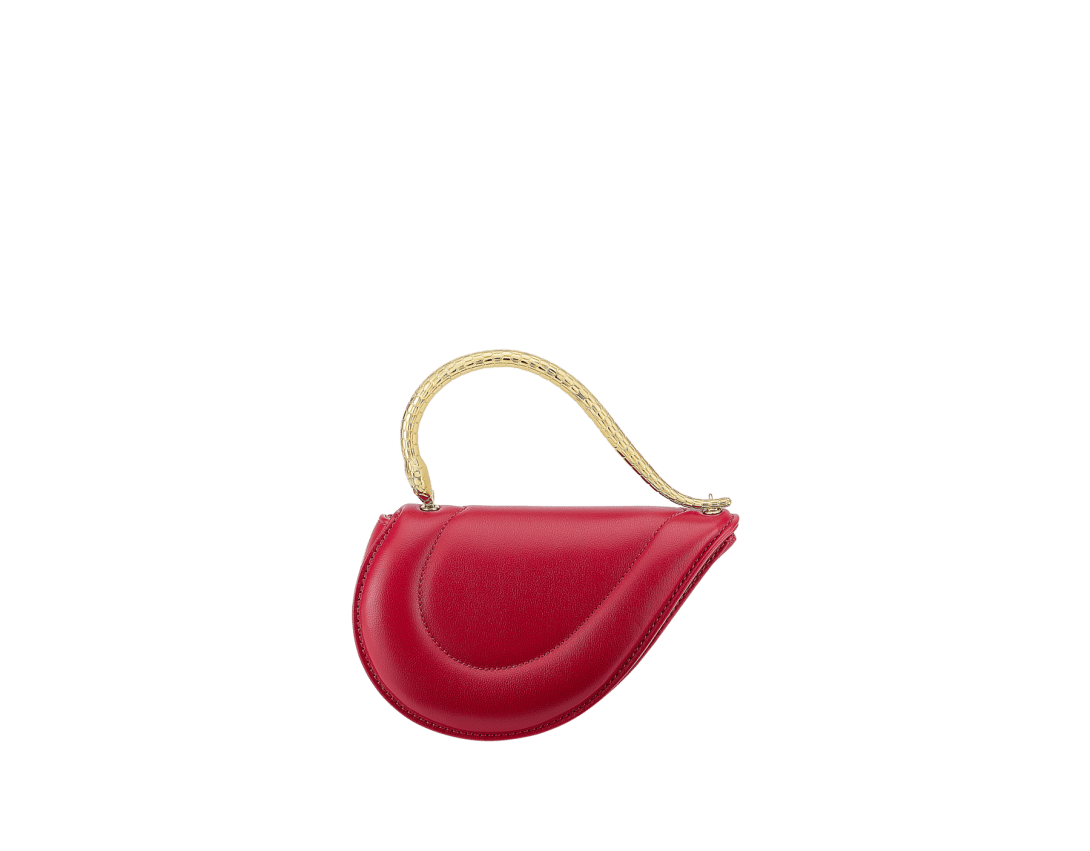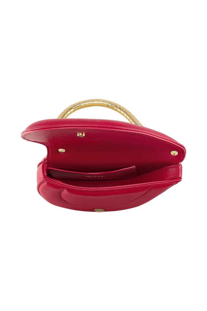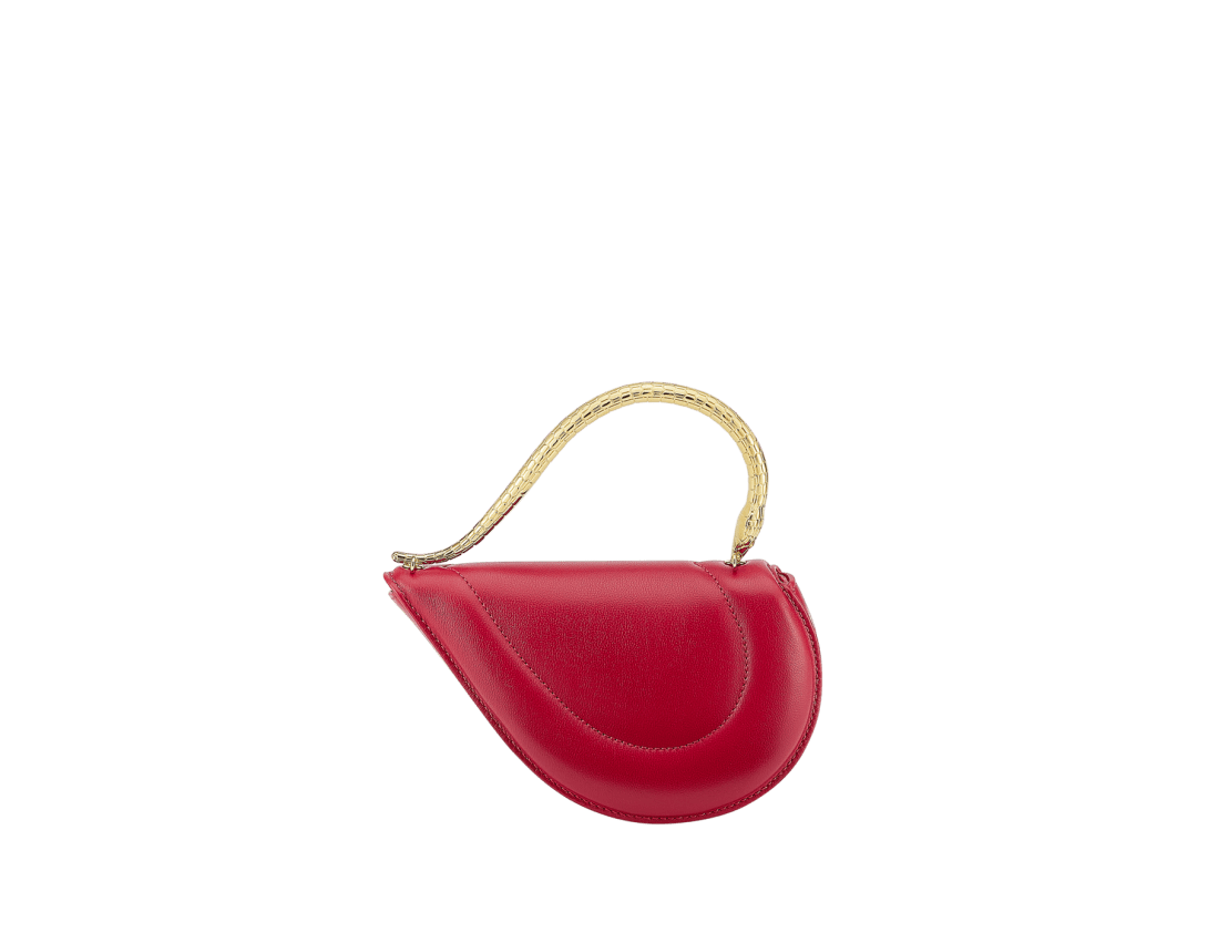 Serpenti Cuoricino mini top handle bag in royal ruby calf leather with royal ruby nappa leather lining. Captivating snake body-shaped top handle in gold-plated brass embellished with engraved scales; press-button closure.