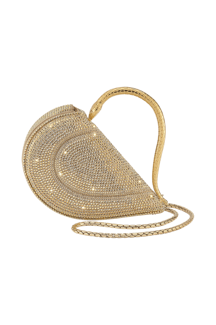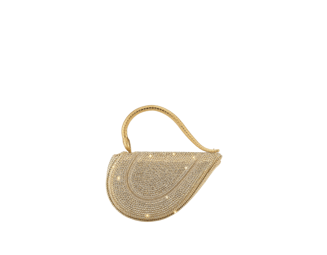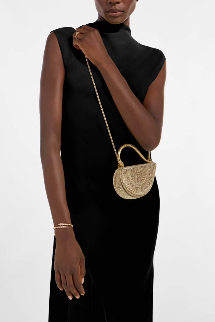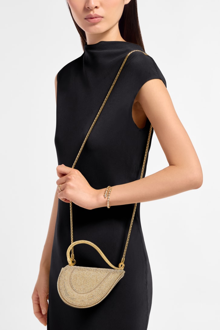 Reimagining the distinctive heart shape in a more compact size, the sparkling Serpenti Cuoricino mini top handle bag is masterfully crafted with gold Neige Pavé Crystals hand-applied on a suede base. Drawing inspiration from Bvlgari’s archives and unrivalled jewellery DNA, the bag’s serpentine metallic handle recalls a famed Serpenti jewellery watch from 1968. The distinctive snake body-shaped chain is detachable, allowing for versatile wear. Featuring a single compartment, the model is complete with a press-button closure and two internal card pockets. Made in Italy.