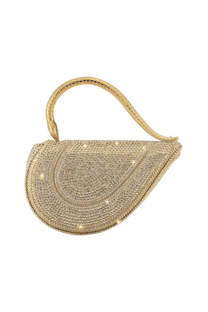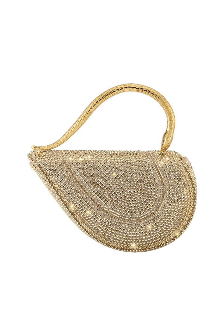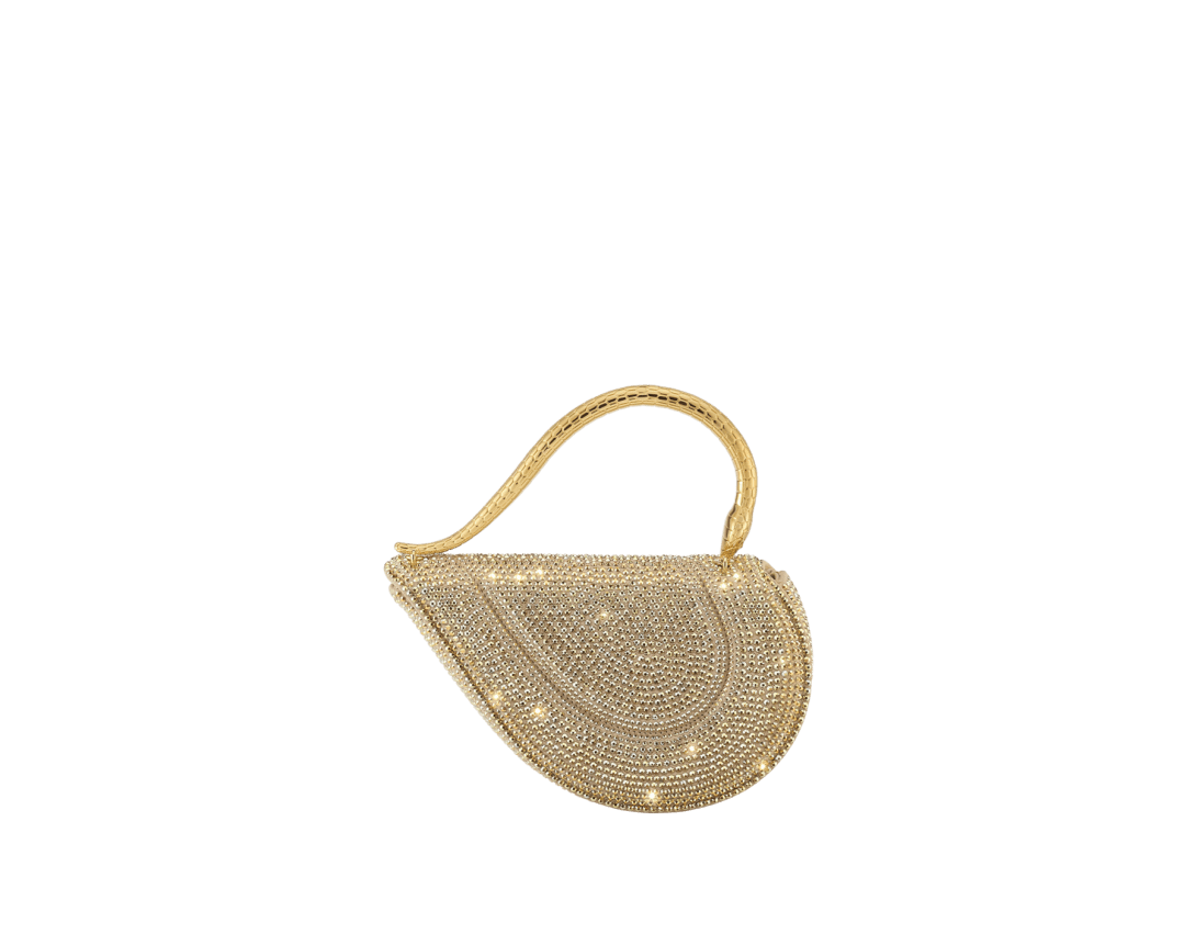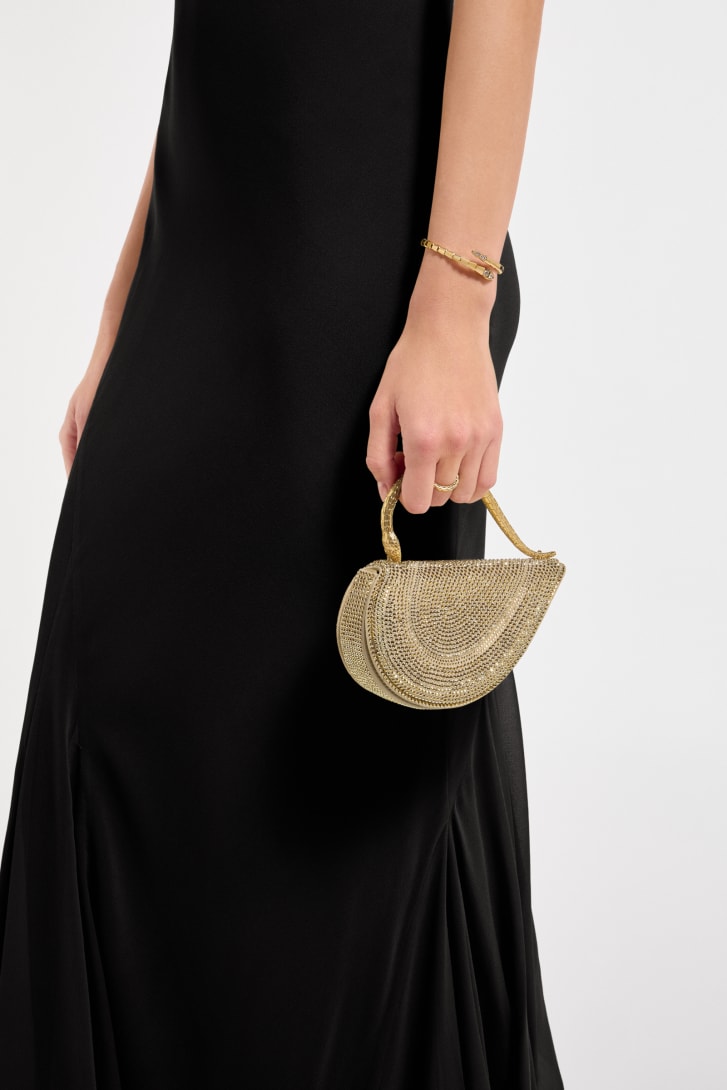 Reimagining the distinctive heart shape in a more compact size, the sparkling Serpenti Cuoricino mini top handle bag is masterfully crafted with gold Neige Pavé Crystals hand-applied on a suede base. Drawing inspiration from Bvlgari’s archives and unrivalled jewellery DNA, the bag’s serpentine metallic handle recalls a famed Serpenti jewellery watch from 1968. The distinctive snake body-shaped chain is detachable, allowing for versatile wear. Featuring a single compartment, the model is complete with a press-button closure and two internal card pockets. Made in Italy.