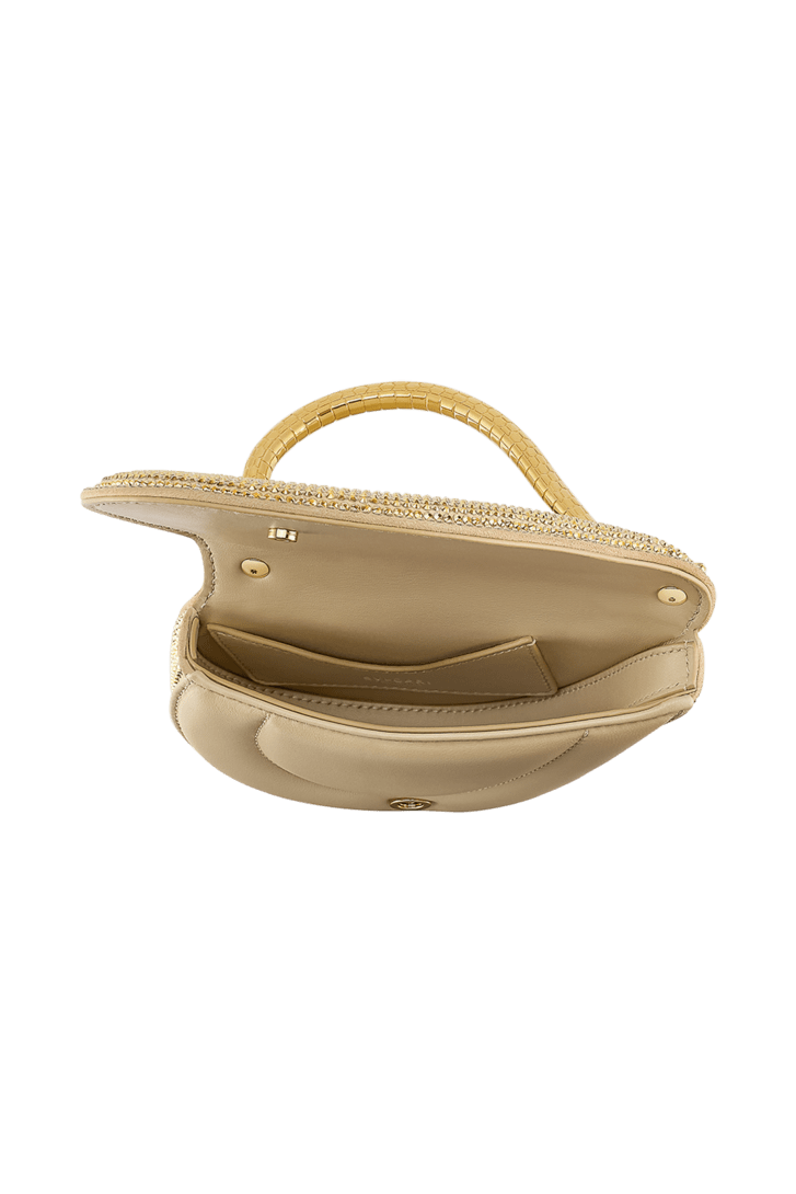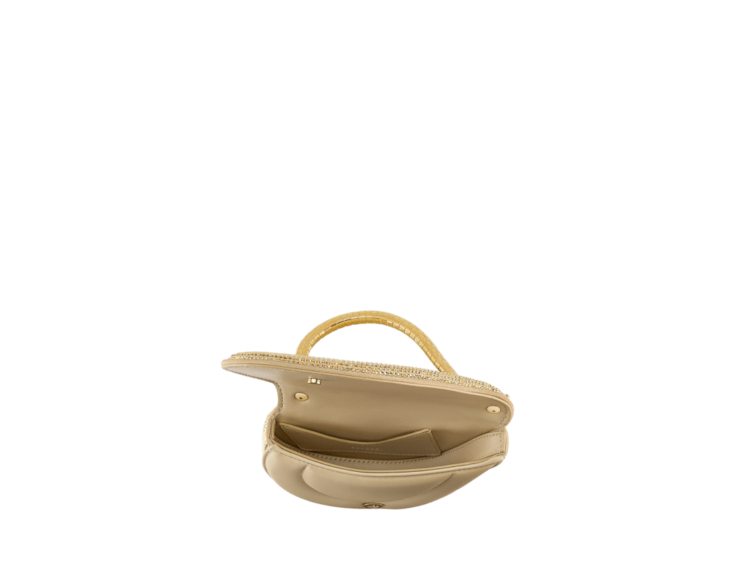 Serpenti Cuoricino mini top handle bag with gold Neige Pavé Crystals applied on a suede base and bright Travertino nappa leather lining. Captivating snake body-shaped top handle in gold-plated brass embellished with engraved scales; press-button closure.