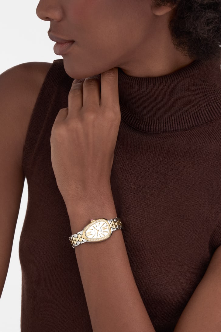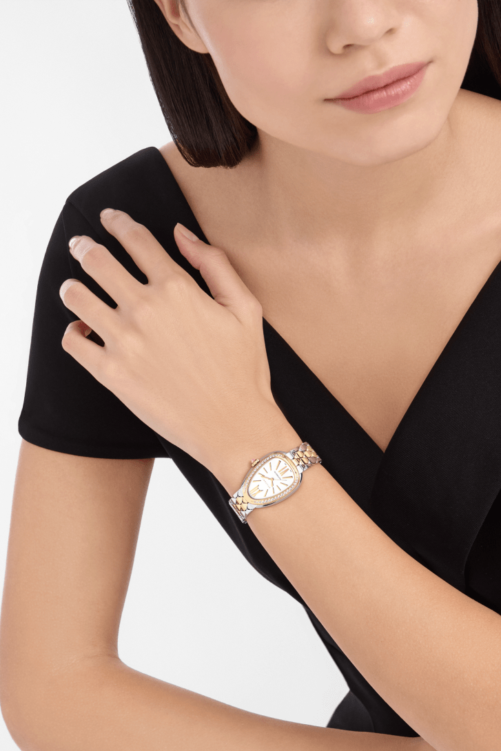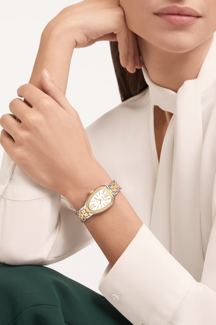 Serpenti Seduttori watch in 18 kt yellow gold and stainless steel with mechanical manufacture movement with automatic winding, diamond-set bezel and white opaline dial. Water-resistant up to 30 metres