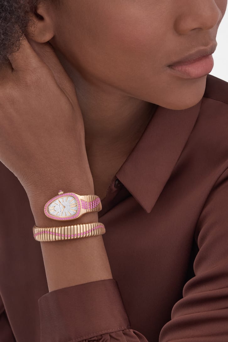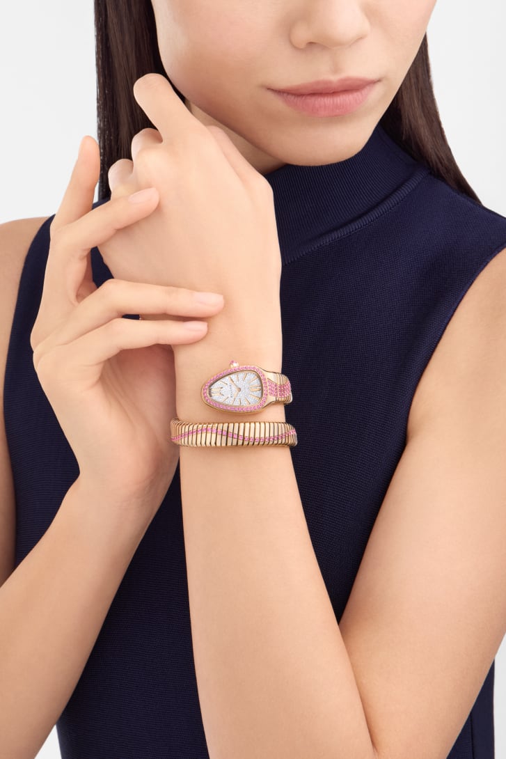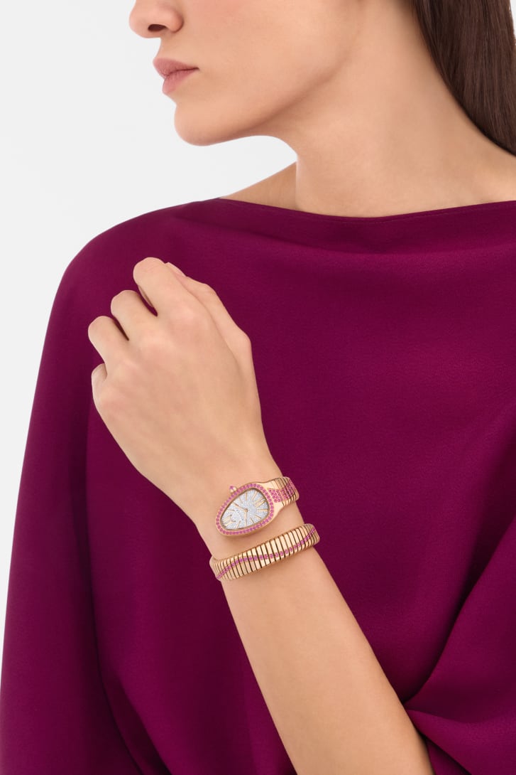 Merging two of the most iconic aesthetic signatures of Bvlgari’s creativity, the Serpenti Tubogas Infiniti single-spiral watch in 18 kt rose gold combines the sinuosity of the snake with the contemporary soul of Tubogas. The head of the mythical animal is rendered by a pink sapphire-set case and a full pavé diamond dial, while the mesmerising suppleness of the bracelet evokes the fluid lines of the serpent’s flexuous body. As a symbol of Serpenti’s endless metamorphosis, a serpentine silhouette in brilliant-cut pink sapphires extends from the watch’s head to the tail. Serpenti Tubogas Infiniti watch with quartz movement, hours and minutes functions, 35 mm 18 kt rose gold case and bezel set with brilliant-cut pink sapphires, 18 kt rose gold crown set with a cabochon-cut pink sapphire, full pavé brilliant-cut diamond dial, rose gold-plated hands, 18 kt rose gold single-spiral bracelet set with brilliant-cut pink sapphires. The creation is set with a total of 262 diamonds (0.80 kt) and 156 pink sapphires (3.80 kt). Water-resistant up to 30 metres.
