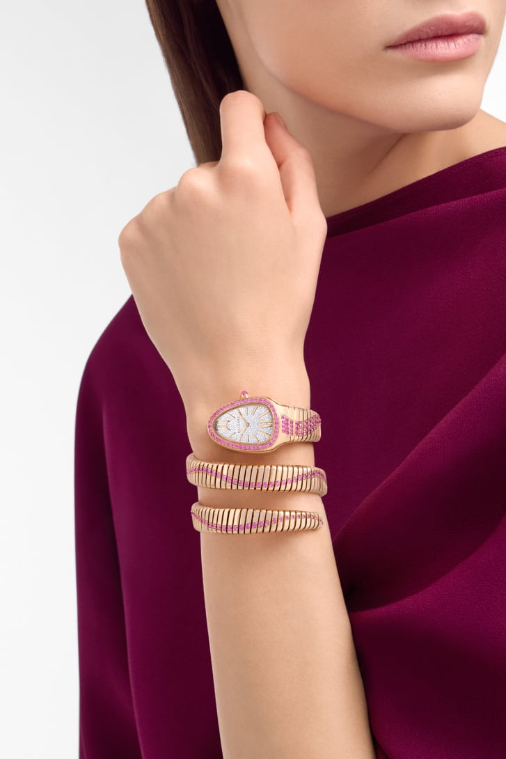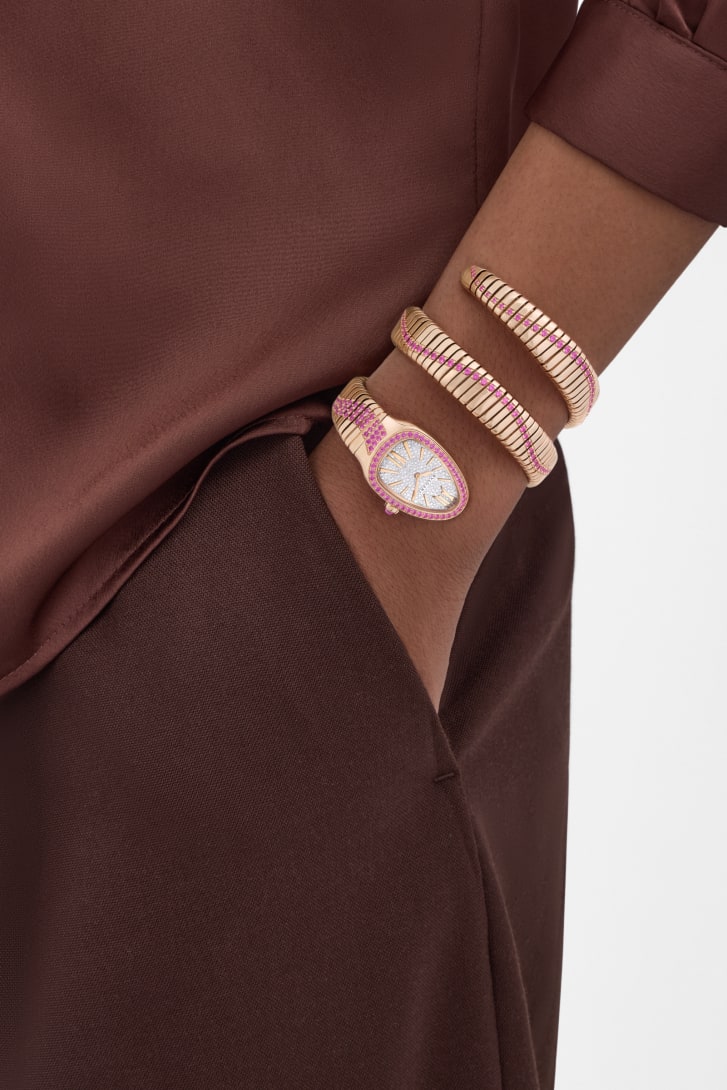 Merging two of the most iconic aesthetic signatures of Bvlgari’s creativity, the Serpenti Tubogas Infiniti double-spiral watch in 18 kt rose gold combines the sinuosity of the snake with the contemporary soul of Tubogas. The head of the mythical animal is rendered by a pink sapphire-set case and a full pavé diamond dial, while the mesmerising suppleness of the bracelet evokes the fluid lines of the serpent’s flexuous body. As a symbol of Serpenti’s endless metamorphosis, a serpentine silhouette in brilliant-cut pink sapphires extends from the watch’s head to the tail. Serpenti Tubogas Infiniti watch with quartz movement, hours and minutes functions, 35 mm 18 kt rose gold case and bezel set with brilliant-cut pink sapphires, 18 kt rose gold crown set with a cabochon-cut pink sapphire, full pavé brilliant-cut diamond dial, rose gold-plated hands, 18 kt rose gold double-spiral bracelet set with brilliant-cut pink sapphires. The creation is set with a total of 262 diamonds (0.80 kt) and 217 pink sapphires (5.60 kt). Water-resistant up to 30 metres.