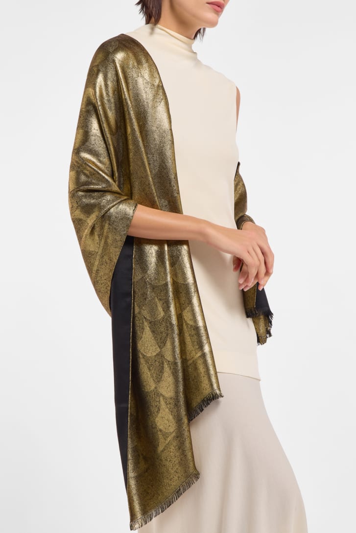 Maxi Calla Metal scarf in fine black and gold silk wool. Made of 60% silk and 40% wool.