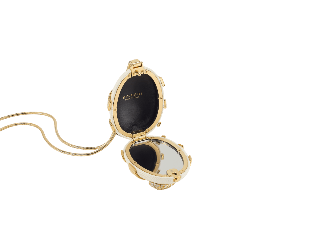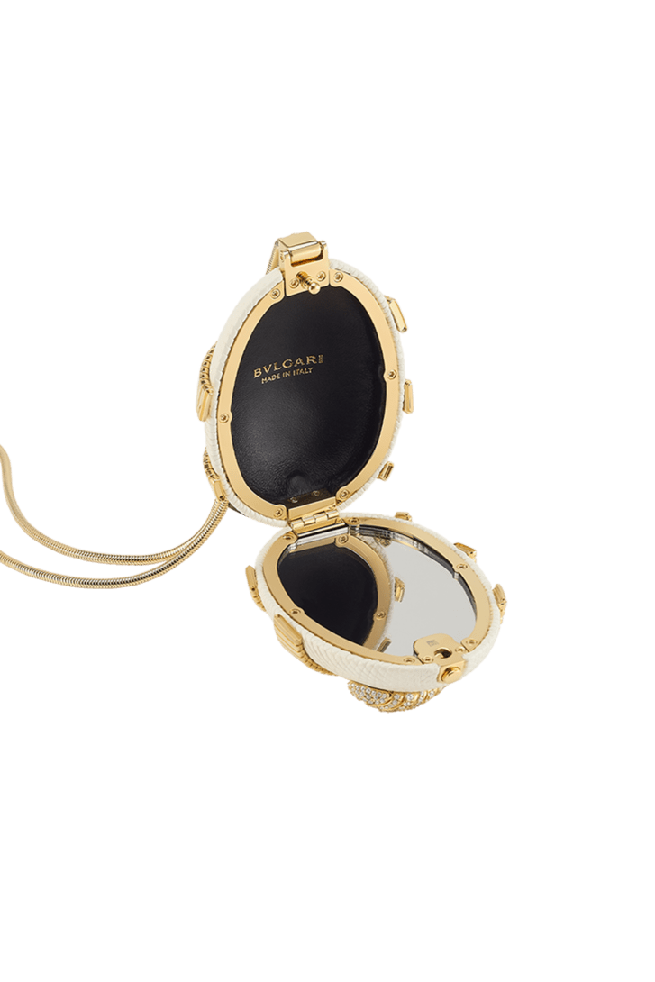 Part of the Bvlgari Icons Minaudière collection – a reinterpretation of Bvlgari’s timeless symbols, embodying both heritage and innovation– the Tubogas mini clutch bridges the universes of jewellery and accessories. Its sculptural egg-shaped silhouette is crafted in refined silver pearl lizard leather, while a sinuous Serpenti Tubogas element in gold-finished brass coils around the piece, illuminated by zirconia details on the head and tail. A sophisticated objet d’art, the clutch is completed by a sinuous rounded chain and features a single compartment with black nappa leather lining, a press-button closure and an internal mirror. Made in Italy.