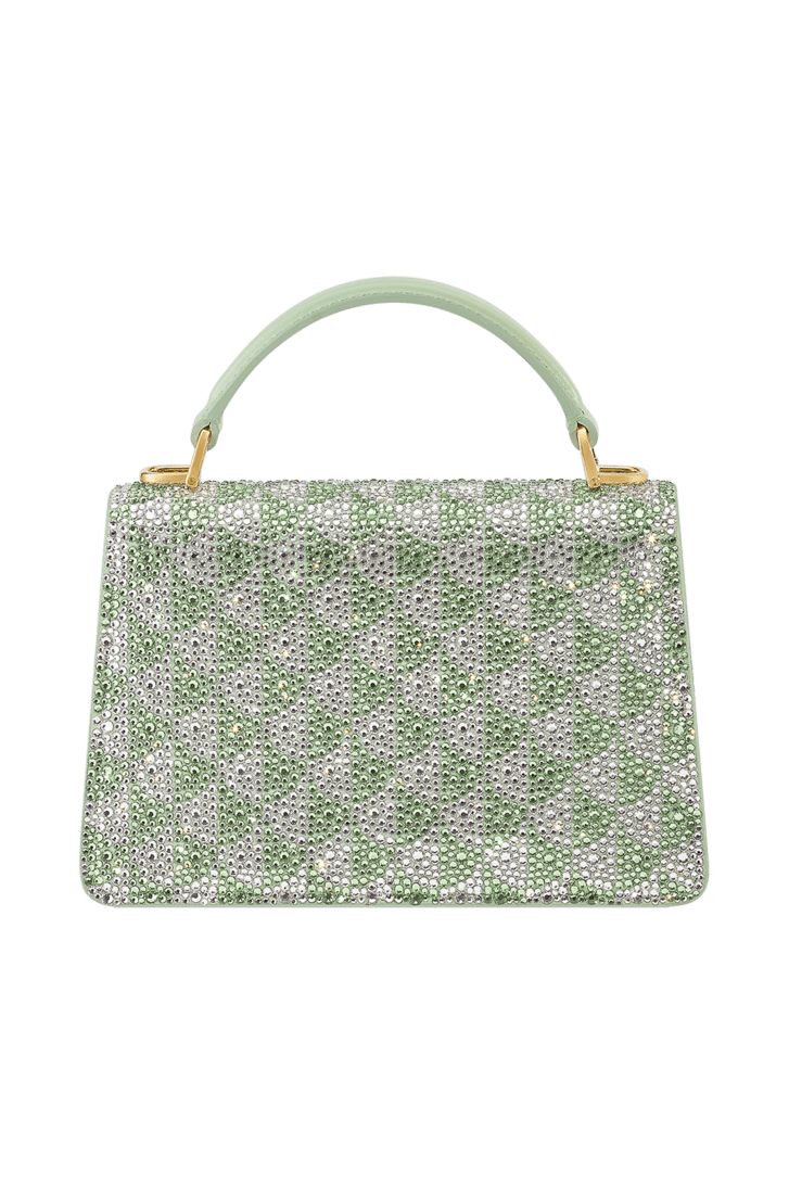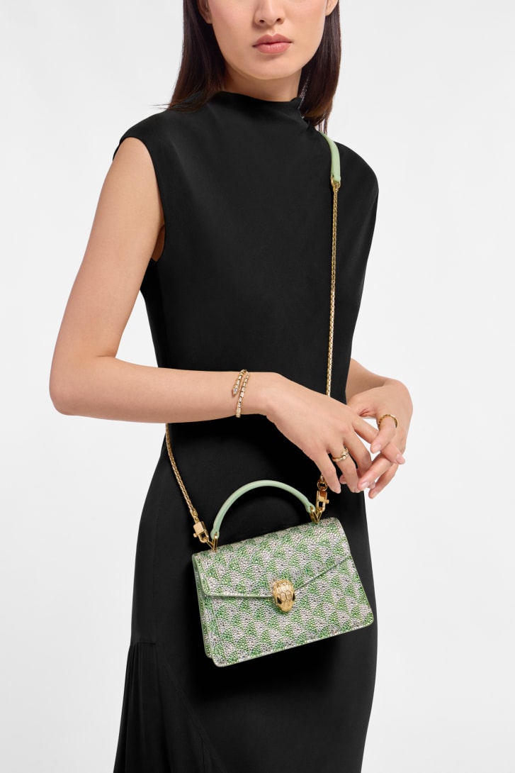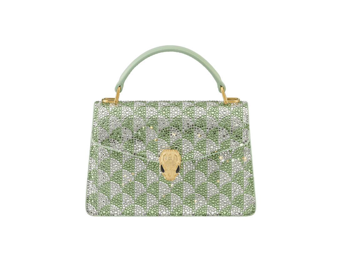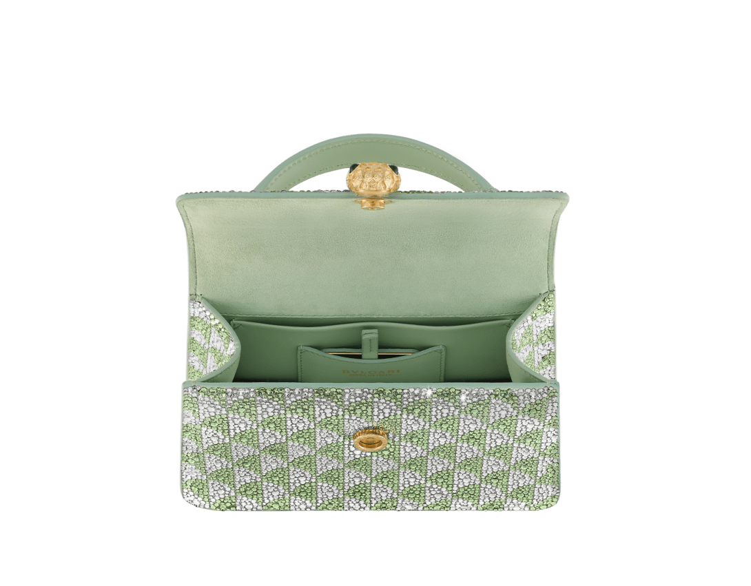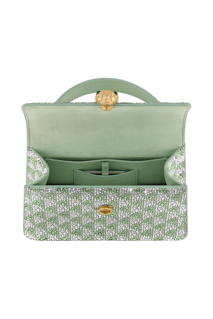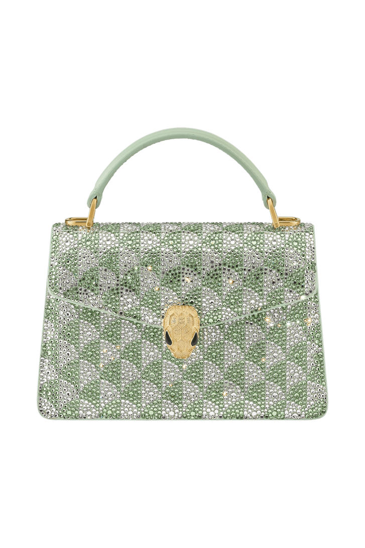 A blend of contemporary appeal, Roman inspiration and magnificent workmanship, the Serpenti Forever mini top handle bag is skilfully crafted in suede with hand-applied light peridot and platinum Calla Crystals that form a sparkling leitmotif drawing from the fan-shaped polychrome mosaics of the Baths of Caracalla. Equipped with a snake body-shaped chain and leather strap, the creation is topped by the iconic snakehead press button closure whose mesmerizing design and scales, inspired by the Serpenti jewels of the 60's, display a diamond-cut effect, namely a grainy metallic texture that shimmers like a snow-set pavé. Featuring a single compartment, the model is completed by an internal flat pocket and a mirror pocket with customizable mirror. Made in Italy.