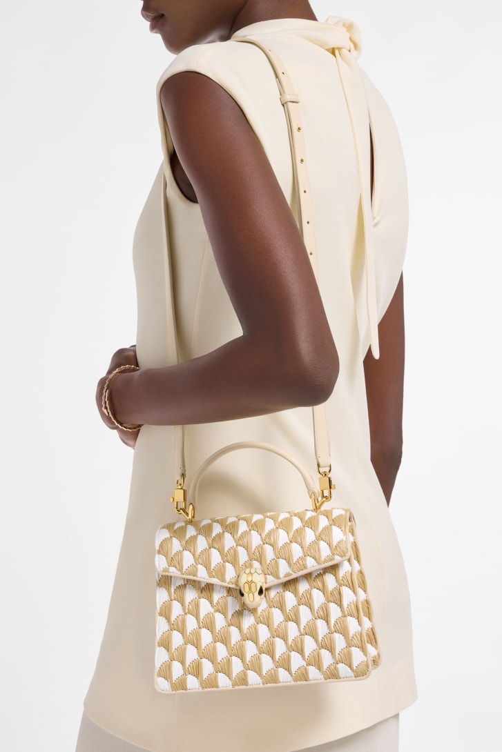 Serpenti Forever medium top handle bag with a white and natural raffia Calla pattern and ivory opal nappa leather lining. Captivating snakehead magnetic closure in gold-plated brass embellished with ivory opal enamel and gold-plated brass scales, and black onyx eyes.