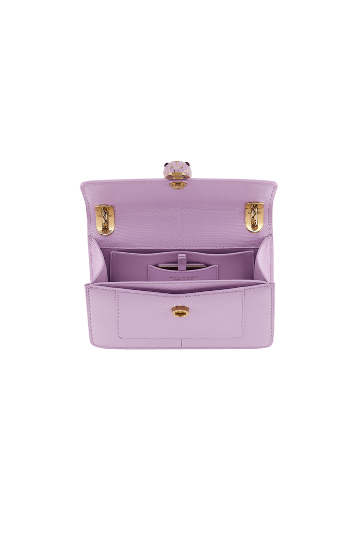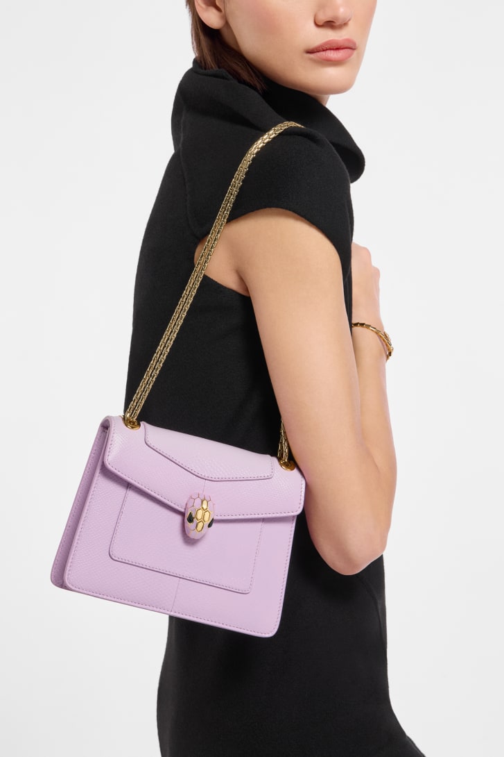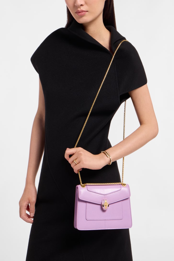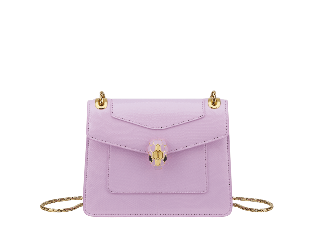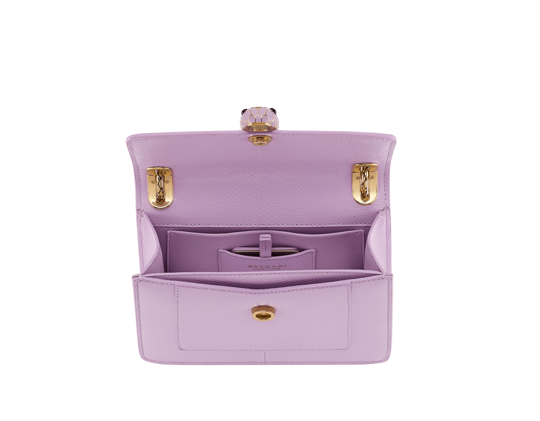 Serpenti Forever Day-to-Night small shoulder bag in light amethyst pure karung with light amethyst nappa leather lining. Captivating snakehead magnetic closure in gold-plated brass embellished with light amethyst enamel and gold-plated brass scales, and black onyx eyes.