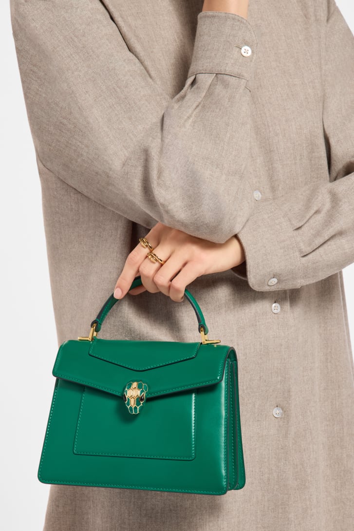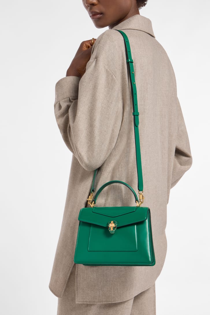 A display of the collection's ever-evolving charm, the Serpenti Forever medium top handle bag blends iconic design with a contemporary twist. Crafted in Smeraldo Prezioso calf leather, the easy-to-wear creation enriches its emblematic features with new details. Sporting a leather strap, this model is topped by the iconic snakehead magnetic closure whose mesmerizing scales and design draw from the Serpenti jewellery of the 60's. The bag is completed by a single compartment, a frontal pocket, an outer back patch pocket, an internal open pocket, a mirror pocket with customisable mirror and the Bvlgari metal logo on the back. Made in Italy.