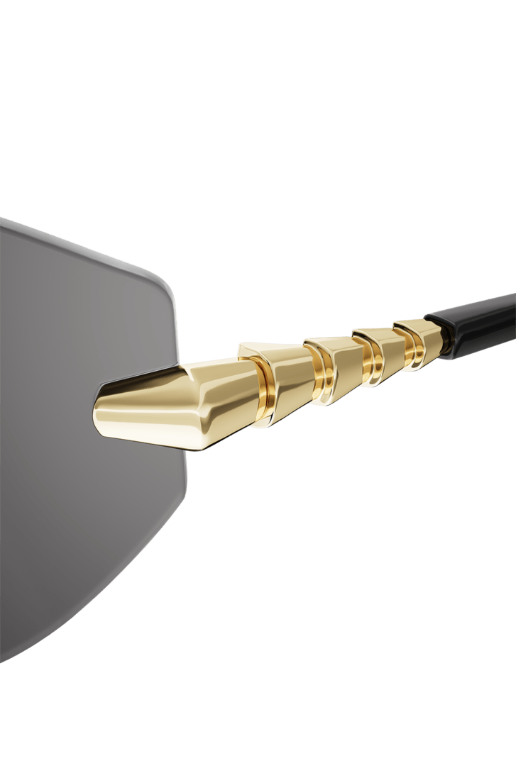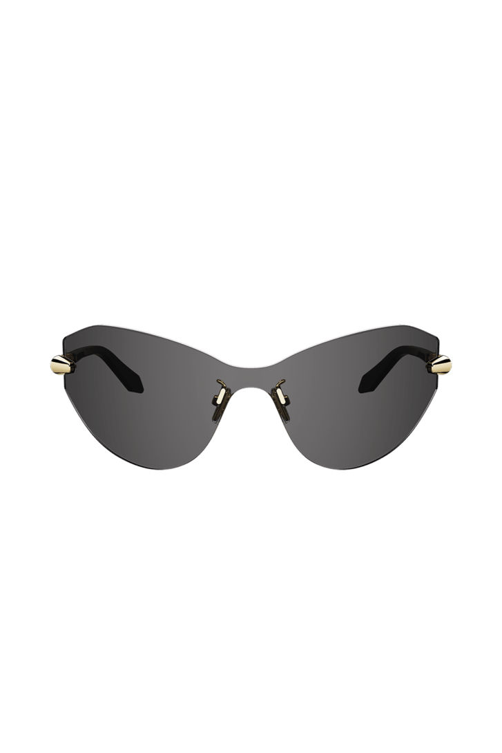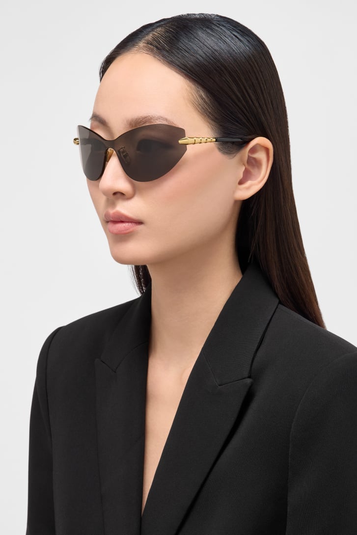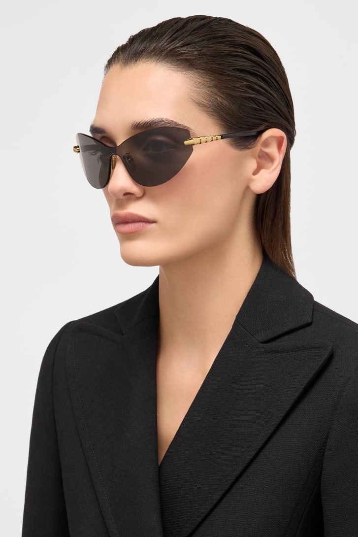 Serpenti Viper sunglasses featuring a cat-eye, wraparound, rimless frame and smoke-coloured lenses. The temples are embellished with a scale motif inspired by the iconic Serpenti jewellery, infusing the style with a unique feminine touch.