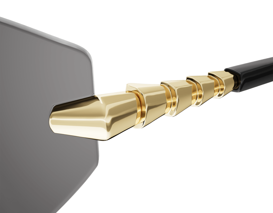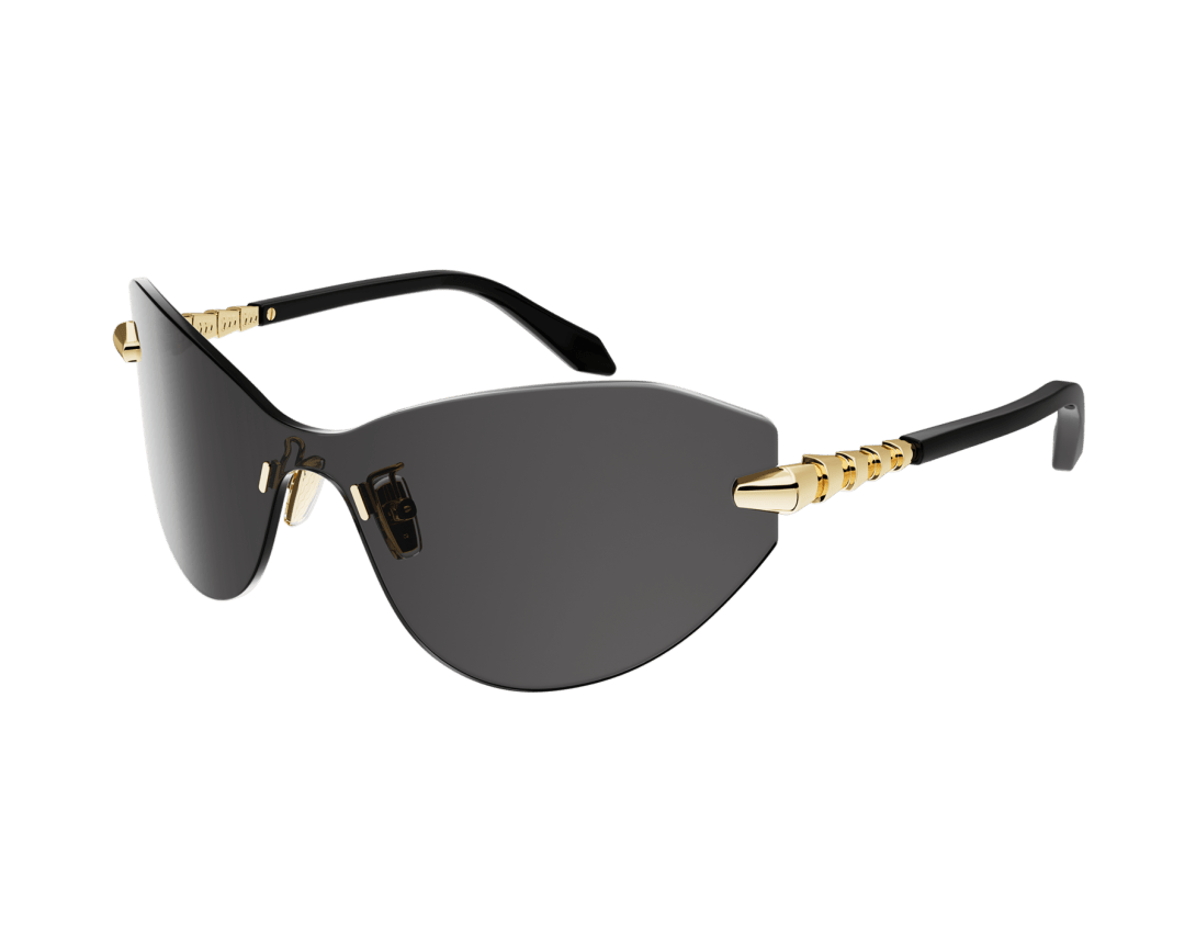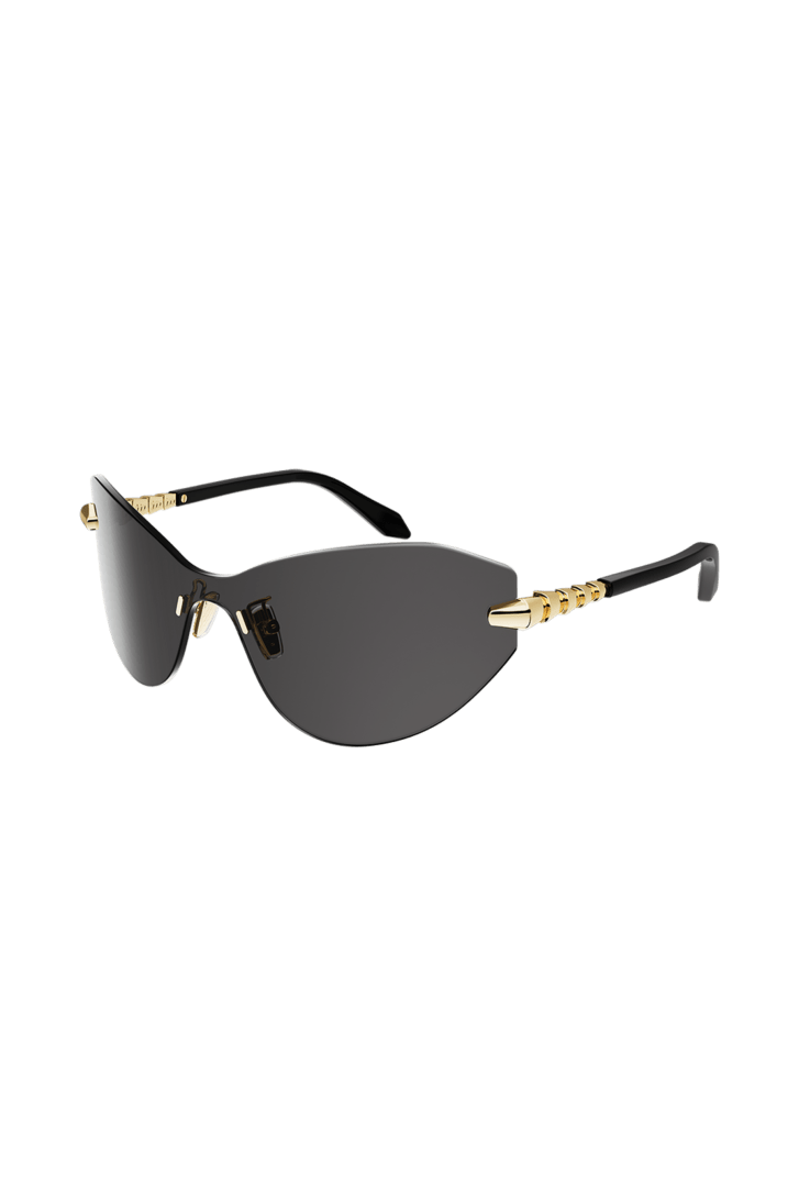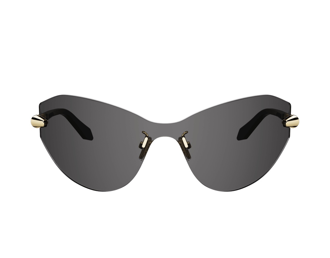 Serpenti Viper sunglasses featuring a cat-eye, wraparound, rimless frame and smoke-coloured lenses. The temples are embellished with a scale motif inspired by the iconic Serpenti jewellery, infusing the style with a unique feminine touch.