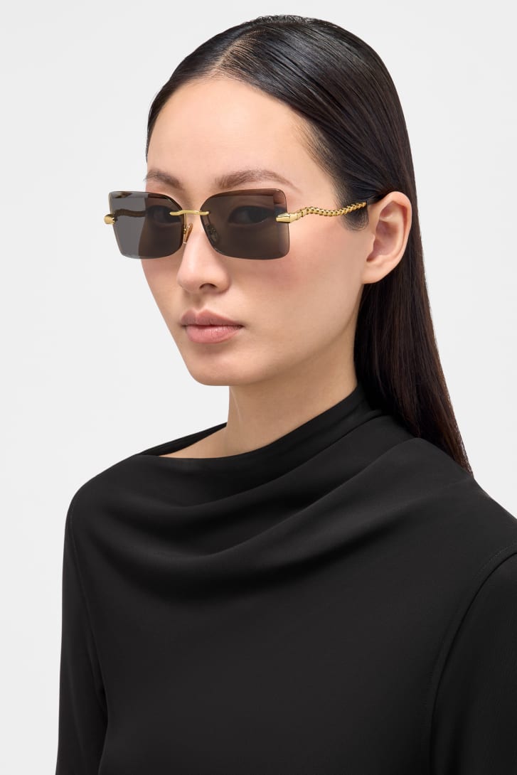 Serpenti Viper sunglasses featuring a rectangular metal frame and smoke-coloured lenses. The sinuous metal temples are elegantly embellished with a scale motif, directly inspired by the iconic Serpenti jewels, infusing this style with a uniquely feminine touch and sophisticated allure