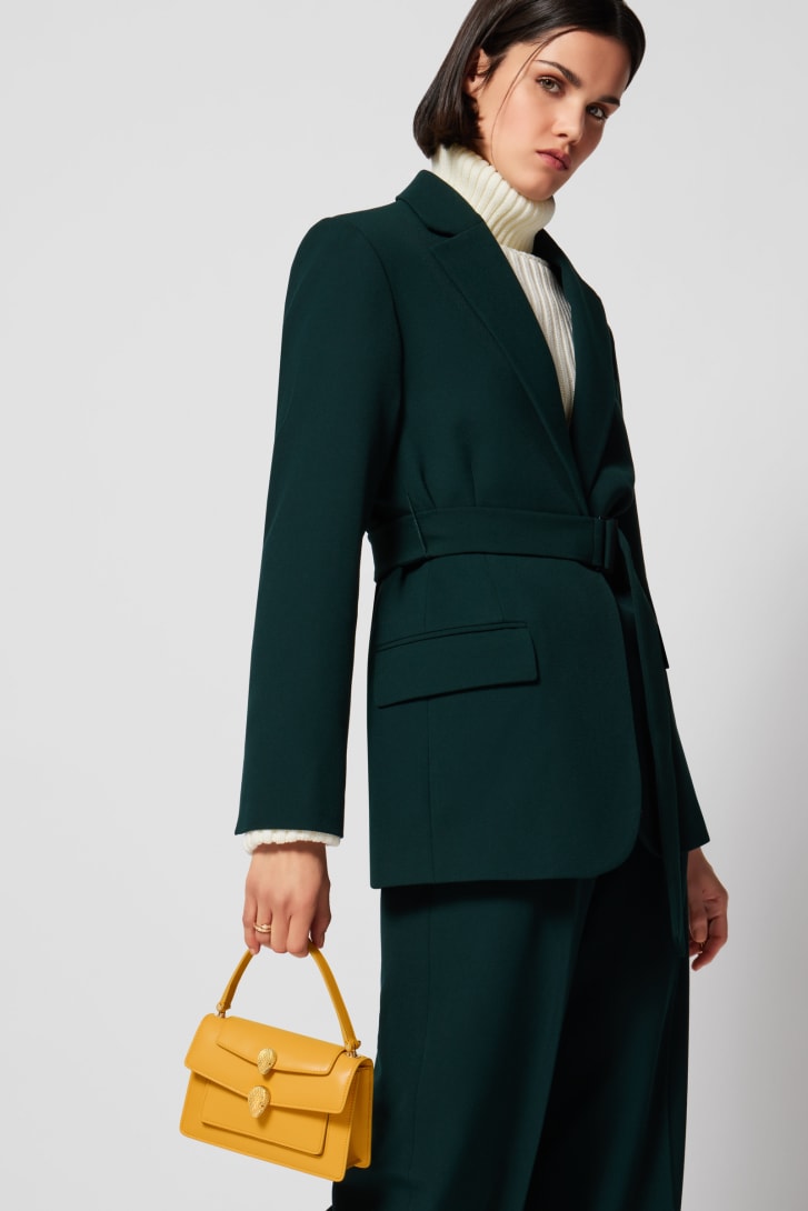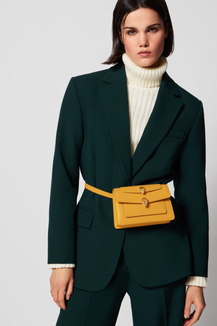 Offering an exceptional interpretation of the iconic Serpenti motif, the Alexander Wang x Bvlgari small belt bag is crafted in saffron amber yellow calf leather. Featuring a top handle and a snake body-shaped chain with leather strap, the versatile creation is topped by a double heritage snakehead magnetic closure, which draws inspiration from a Bvlgari watch of the 1960s. Featuring a single compartment, the model is complete with a front pocket, an outer flap pocket, an inner open pocket and a hot-stamped "Alexander Wang Bvlgari" logo. 18.5 x 11.5 x 6.5 cm - 7.3 x 4.5 x 2.6 inches. Made in Italy.