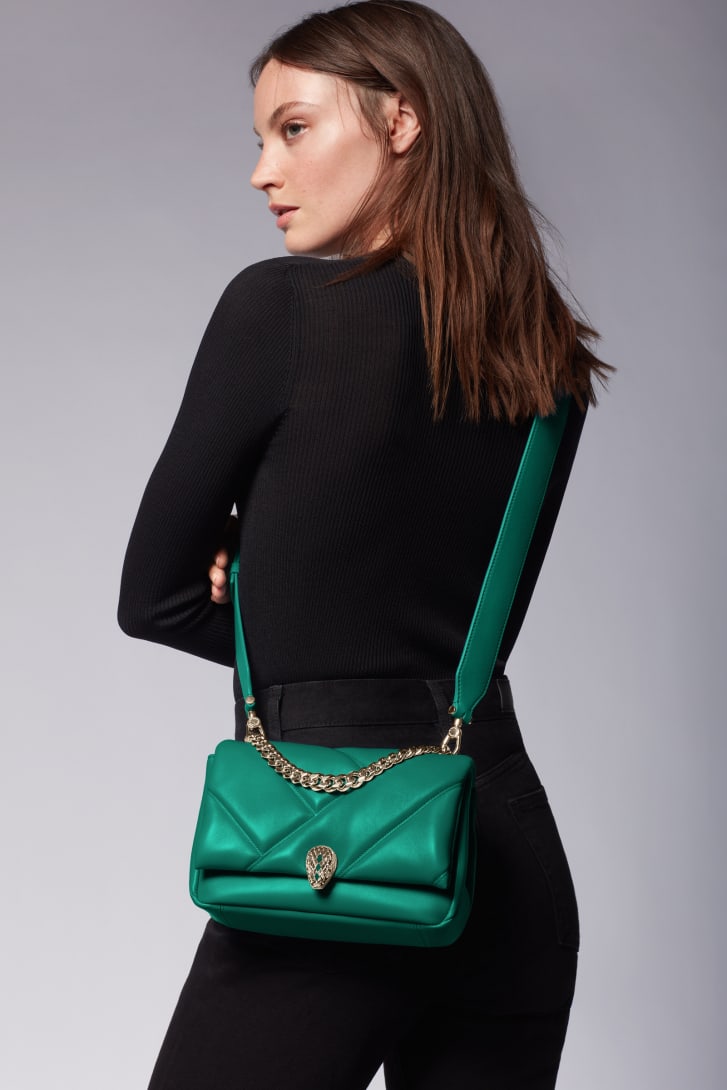 Crafted in soft jade green calf leather with a maxi matelassé pattern inspired by the sleek surface of cabochon-cut gems, the Serpenti Cabochon Maxi Chain small crossbody bag combines a bold graphic motif with captivating details. Equipped with a chain that evokes the bold style of the Maison's famous jewellery and serves as a handle, the creation is topped by the heritage snakehead closure, embellished with gemstones, which draws inspiration from a Bvlgari watch from the 1960s. This model features a leather strap, a single compartment, an open pocket and zipped pocket inside, a card slot and an internal metal tag with the Bvlgari logo. 21.5 x 15 x 7 cm - 8.5 x 5.9 x 2.8 inches. Made in Italy.