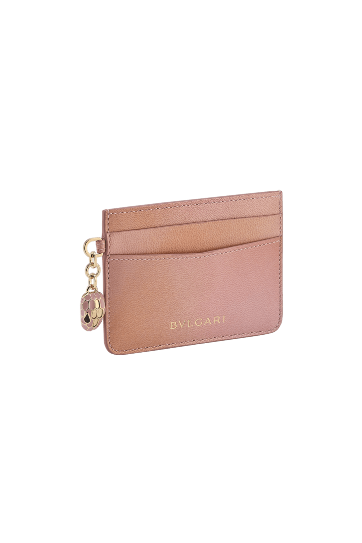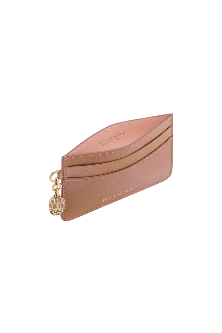 Exquisitely crafted in pearl pink goat leather, the Serpenti Forever card holder features the iconic snakehead charm, whose hypnotic coloured scales and design draw from the Serpenti jewels of the '60s. Four credit card slots, a central pocket and the Bulgari metal logo on the back complete the model. 10.5 x 7.5 x 0.5 cm – 3,9 x 2.9 x 0.2 inches. Made in Italy.
