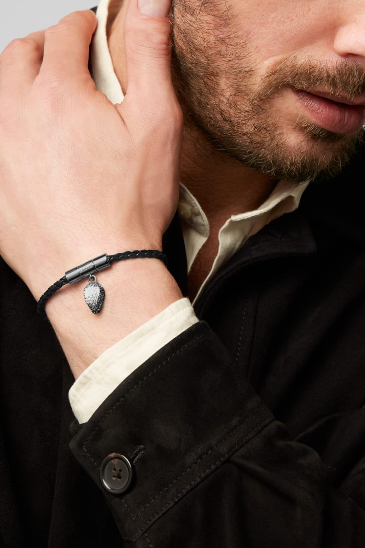 Serpenti Forever bracelet in black braided calf leather. Captivating snakehead charm in dark ruthenium-plated brass, complete with red enamel eyes, attached to the clasp at the front.