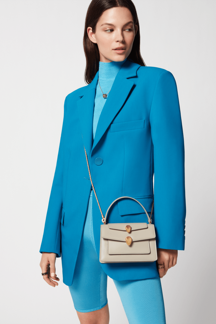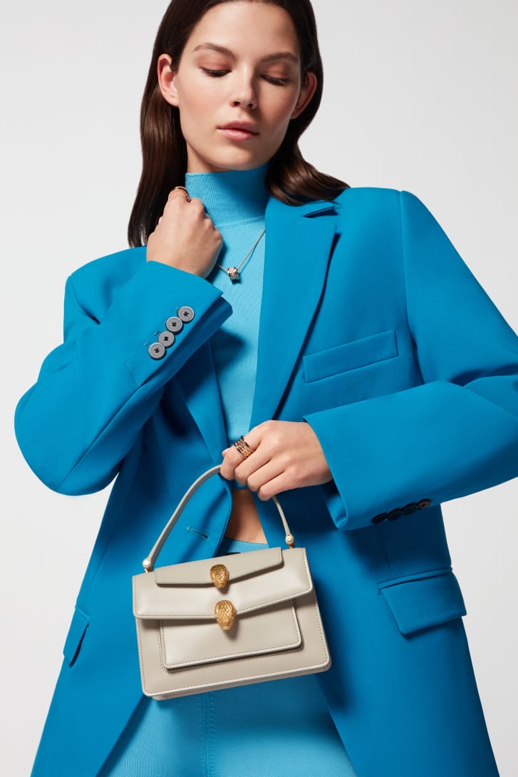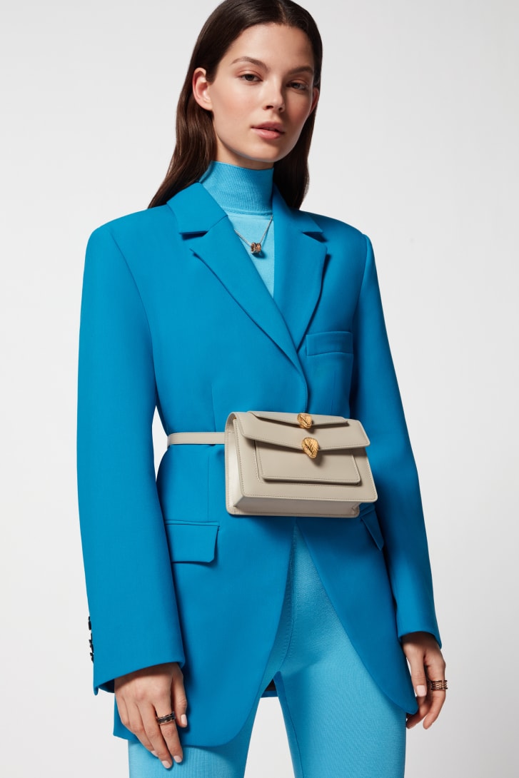 Offering an exceptional take on the iconic Serpenti motif, the Alexander Wang x Bvlgari small belt bag is crafted in moonbeam pearl light grey calf leather. Endowed with a top handle and a snake body-shaped chain with leather strap, the versatile creation is topped by a double heritage snakehead magnetic closure, which draws inspiration from a Bvlgari watch from the 1960s. Featuring a single compartment, the model is complete with a front pocket, an outer flap pocket, an inner open pocket and a hot-stamped "Alexander Wang Bvlgari" logo. 18.5 x 11.5 x 6.5 cm - 7.3 x 4.5 x 2.6 inches. Made in Italy.
