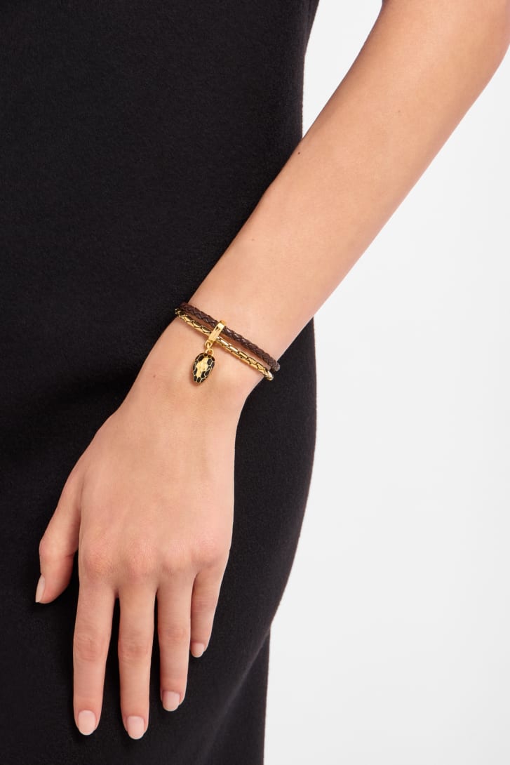 Serpenti Forever bracelet in chestnut opal braided calf leather and gold-plated brass chain with magnetic clasp closure. Captivating snakehead charm with black enamel and gold-plated scales, and black enamel eyes.