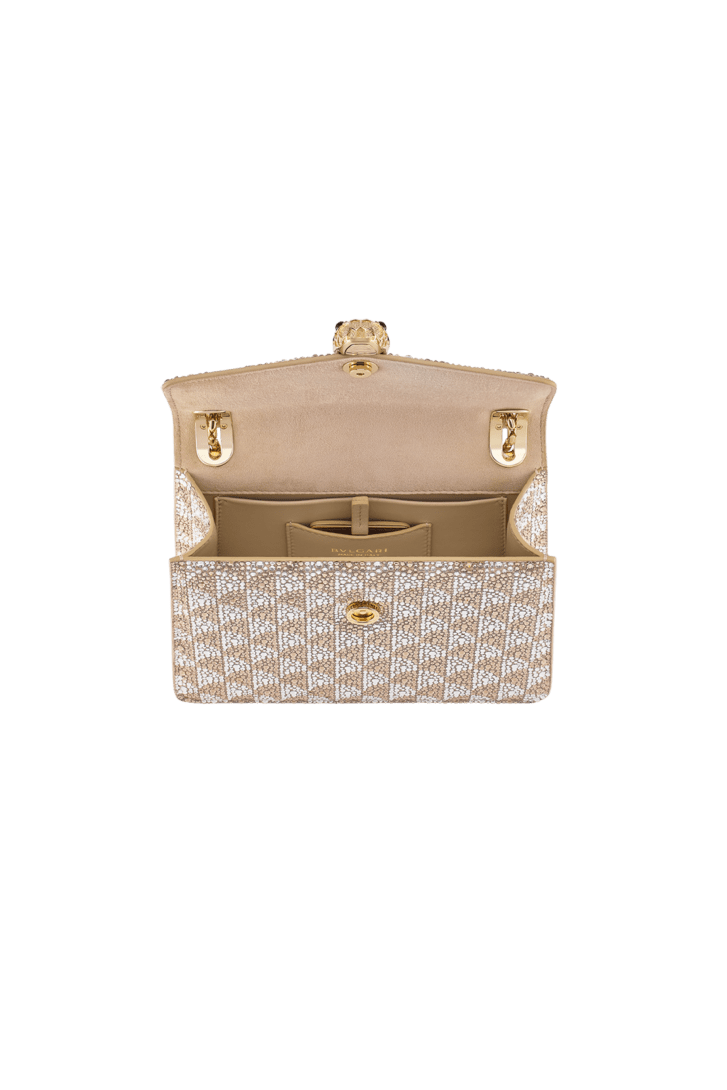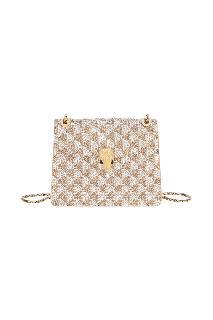 Serpenti Forever Day-to-Night small shoulder bag with a topaz and platinum Calla Crystals pattern applied on suede, and a bright Travertino nappa leather lining. Captivating snakehead magnetic closure in gold-plated brass embellished with diamond-cut engraving on the scales, and black onyx eyes.